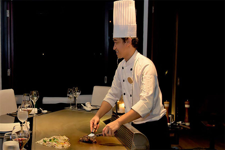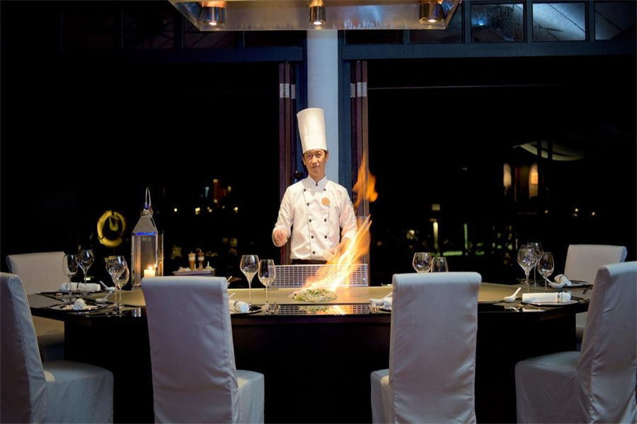 餐厅介绍:每天晚上,围坐在铁板桌子前,看厨师在您眼前在铁板上烹饪出美味的食物,这现场烹饪不仅会勾引您的味蕾,它也将让您体验不平凡的晚餐的经历。还会提供新鲜的龙虾和最好的神户牛肉。