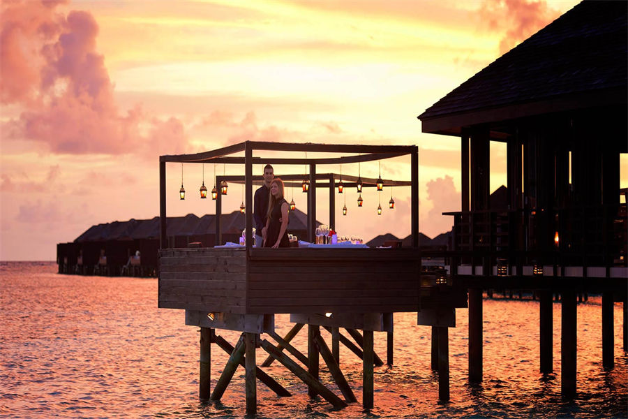 房型介绍:182㎡的日落水上套房,全岛4栋,宽敞的水上别墅甲板可观赏到壮观的美丽景色,可直通向礁湖。宽敞的客厅,配有四脚大床,一张大沙发,休闲椅,14㎡的私人泳池。