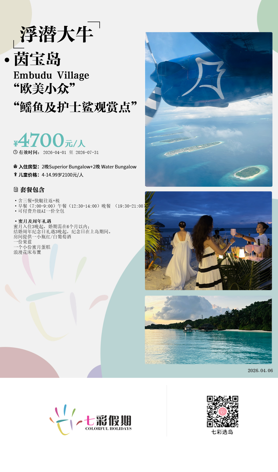 马尔代夫艾布度(Embudu Village ),位于南马累环礁北部,25-30分钟快艇上岛(上岛快艇可在7:00-22:00安排,离岛快艇最晚为16:45),距著名的鳐鱼及护士鲨观赏点仅100米,8分钟船程。岛屿被壮观的环岛珊瑚礁所围绕,且距离极近,对浮潜、潜水新手十分友好。岛屿也因优越的地理位置可于船程30分钟-1小时内到达南、北马累环礁的40+潜点,是资深玩家梦寐以求的潜水天堂。