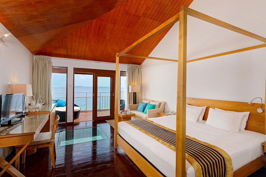 房型介绍:宽敞舒适的度假胜地设有独特的海平面窗户,可在客房内静静地观鱼水上别墅宽敞舒适,地板上有一扇海窗,您可以在舒适的房间里观看鱼,还配有舒适的床、充足的储物空间和书桌。