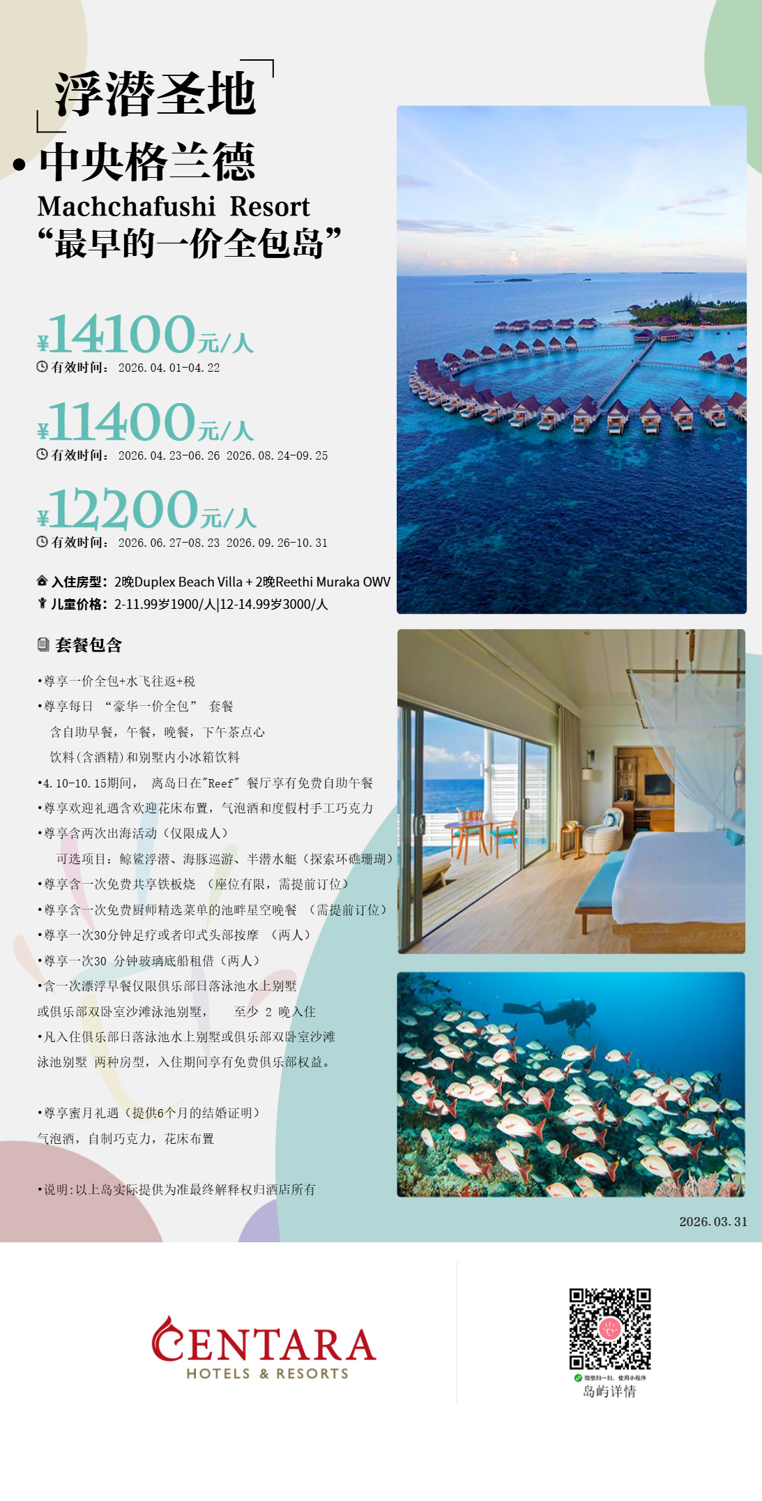 马尔代夫中央格兰德,曾用英文名Centara Grand Island Resort&Spa,在2025.1.15后更名为Machchafushi Resort&Spa Maldives,距离马累大概70公里,乘坐水飞即可抵达。马尔代夫老牌一价全包岛屿,七彩曾经把它和莉莉、鲁滨逊、密度帕如,合并称为全包的四朵金花。当然也是最受国人青睐的全包岛屿之一,从开业至今一直是热门度假村。岛屿非常小,饶岛一周仅仅只需要20分钟,但是仍然修建了2个主泳池区域,2个出海码头区域;拥有双层复式家庭房型是一大特色,2期新修的水屋也带私人泳池;岛上泰式餐厅非常有特色。上岛码头就是度假村前台,精通各国预言的管家会协助办理入住、以及未来几天的活动餐饮等,非常便捷。而第二码头和沙滩别墅,从防浪堤下海就是岛屿最佳浮潜点,距离岸边仅仅10米左右,拥有大量鱼群和珊瑚。