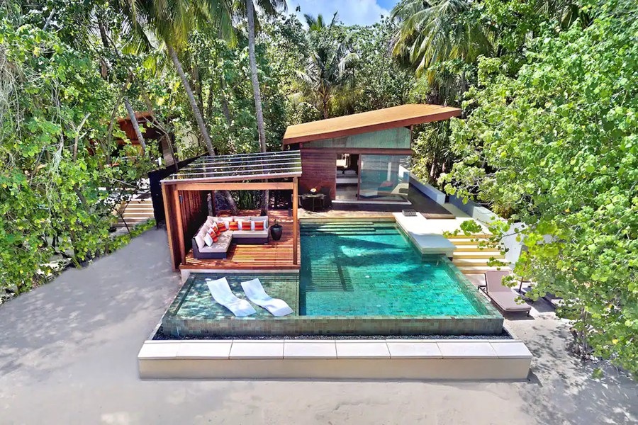 房型介绍:全岛3栋的双卧沙滩泳池别墅,面积为300㎡,标配私人泳池,包括一张特大床、私人室外水磨石浴缸和淋浴区,令您倍感宾至如归。还设有配有两张单人床的44㎡第二间卧室和独立浴室。别墅设有带半入水日光浴床的大型泳池、户外露台/凉亭。