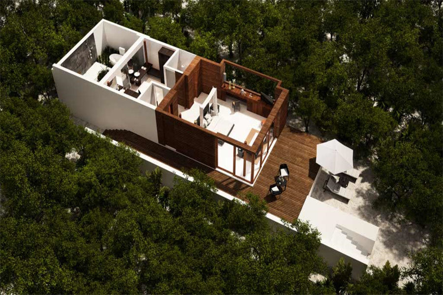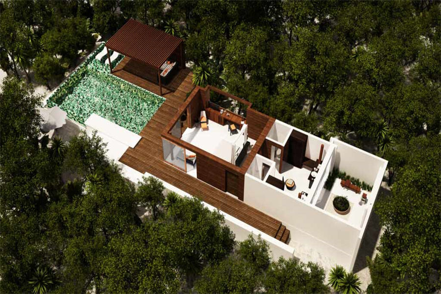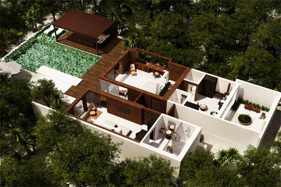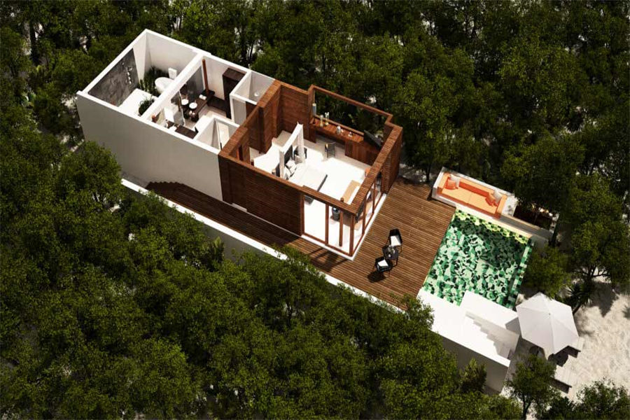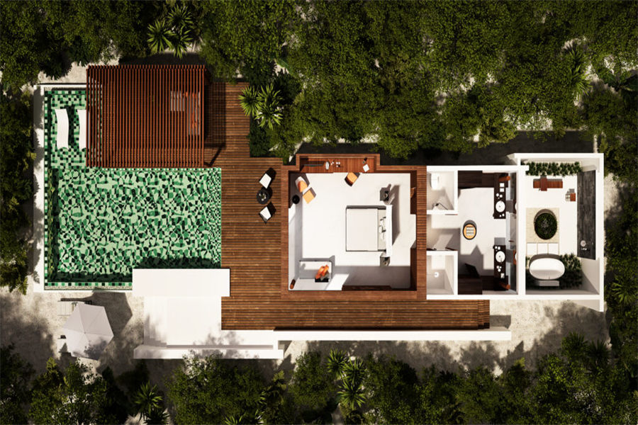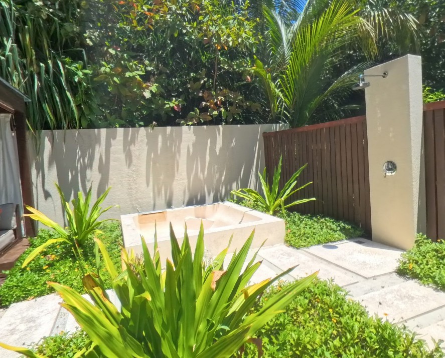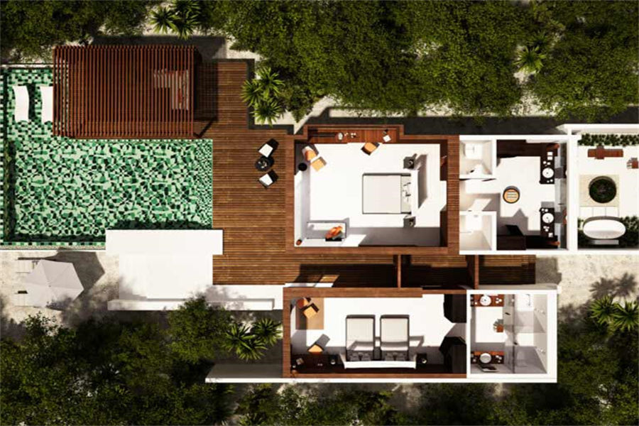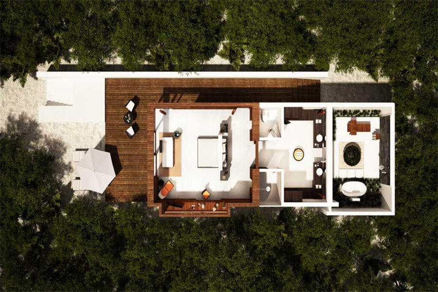 房型介绍:全岛10栋的沙滩别墅,面积为165㎡,别墅配有一张特大床、躺椅,设有带桌椅、日光浴床的私人露台、带水磨石浴缸的室内和室外淋浴区以及可直通海滩的雨林淋浴区。