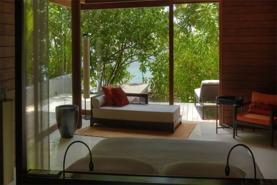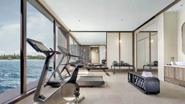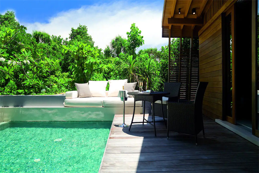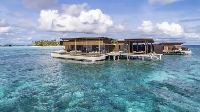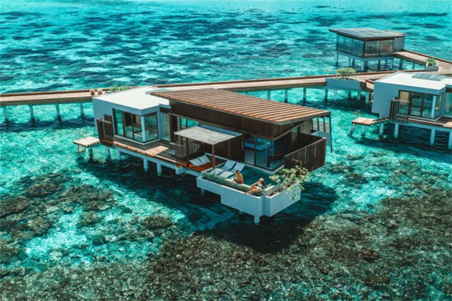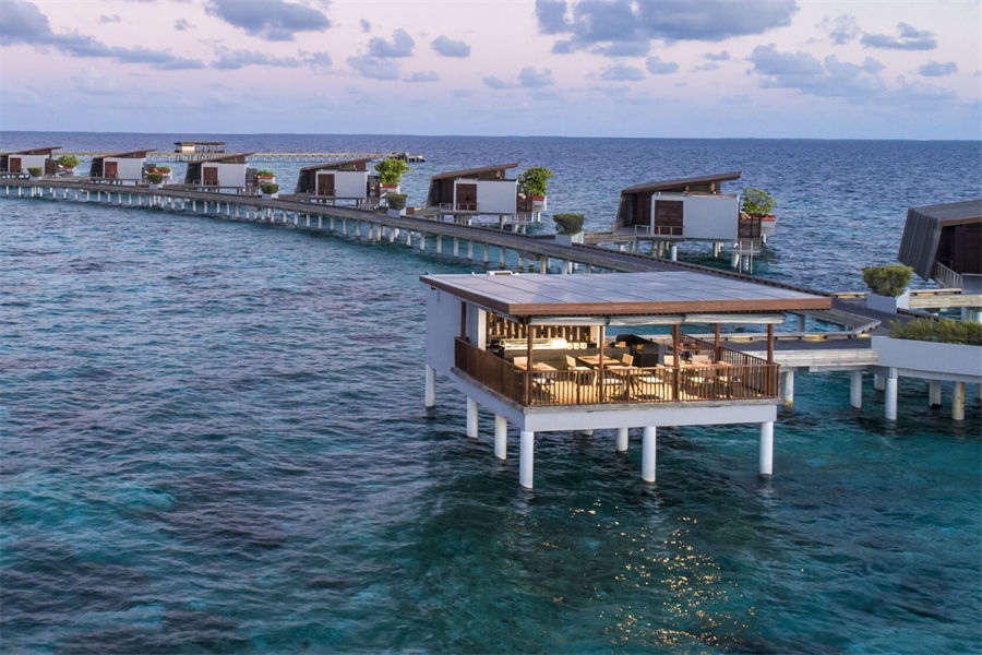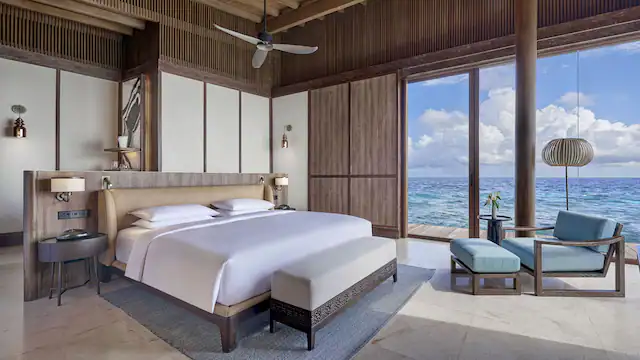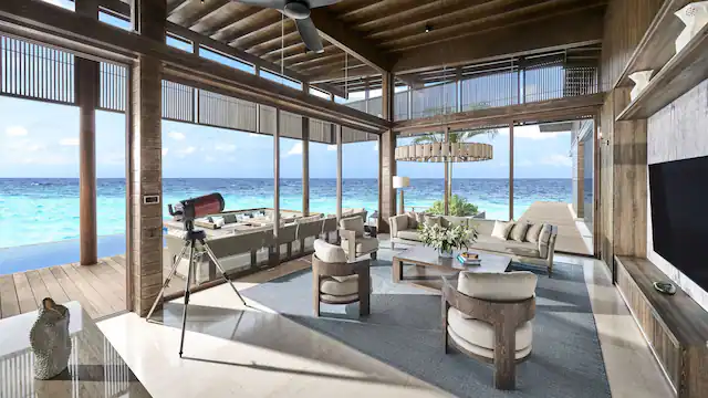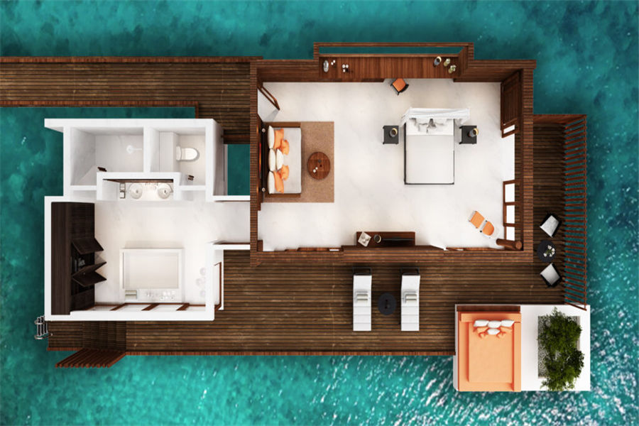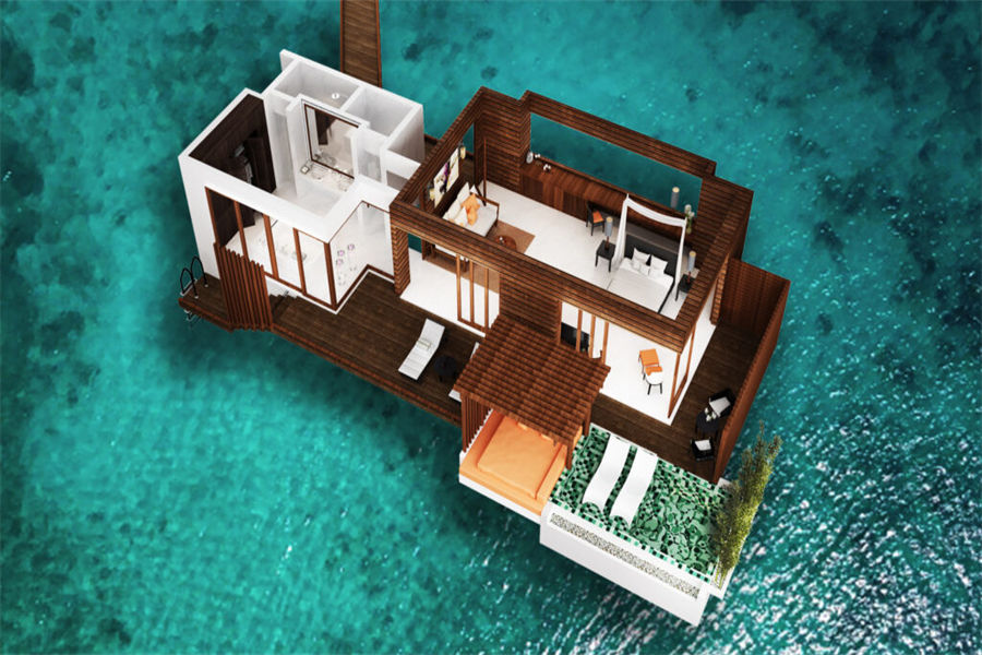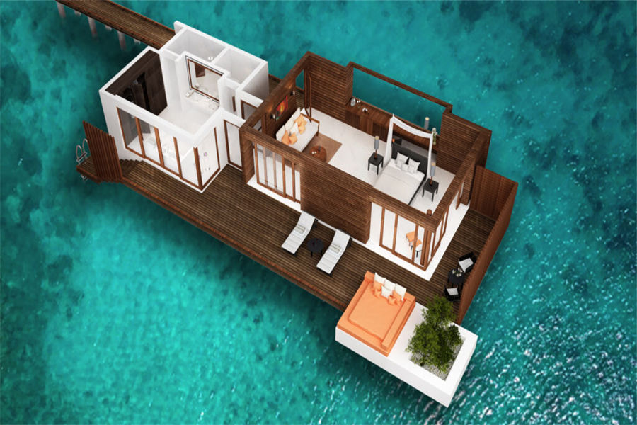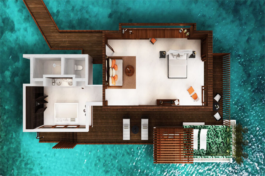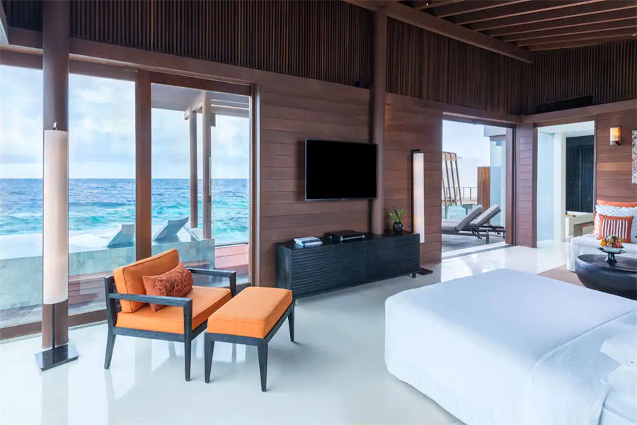 房型介绍:全岛1栋的水上公寓,面积为895㎡,可欣赏印度洋全景,设有 16 米长的淡水无边泳池和三间带套间空调浴室的卧室,最多可容纳 6 人舒适入住。