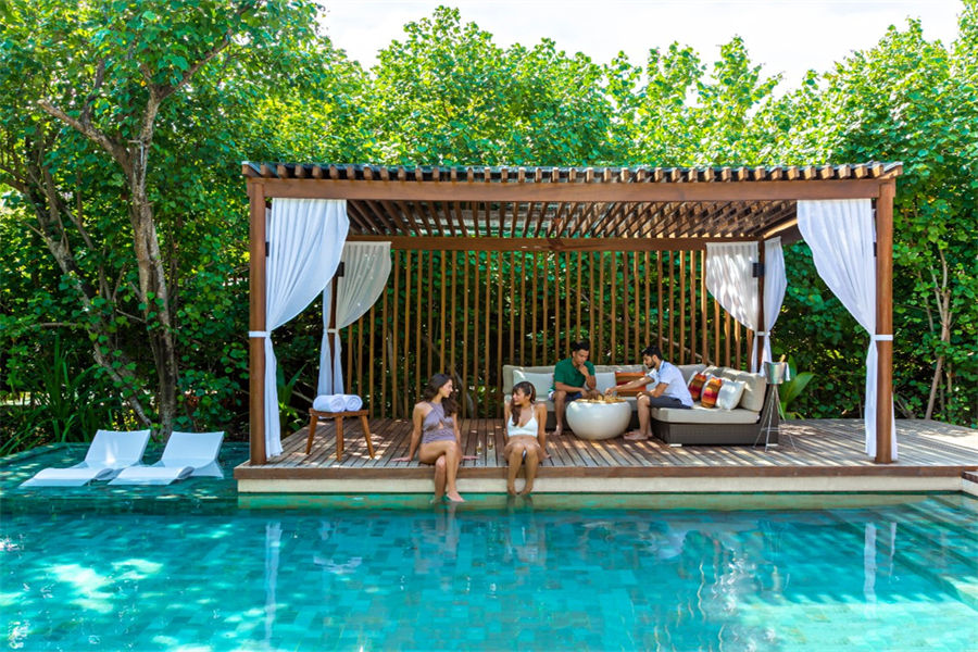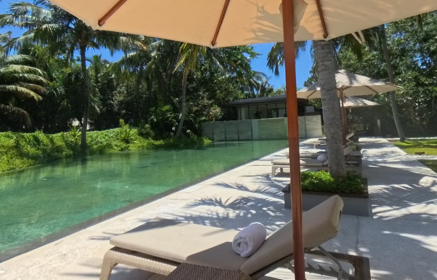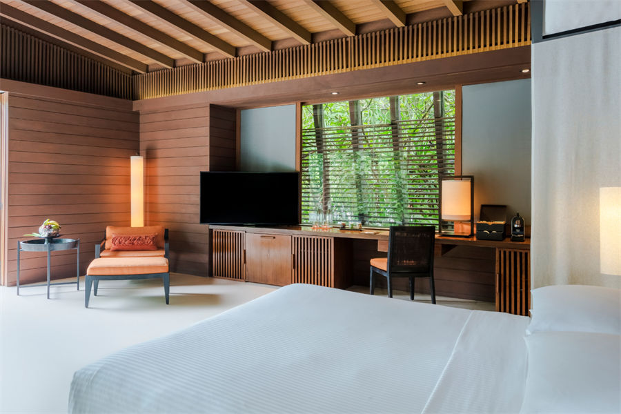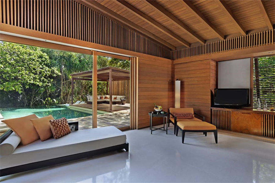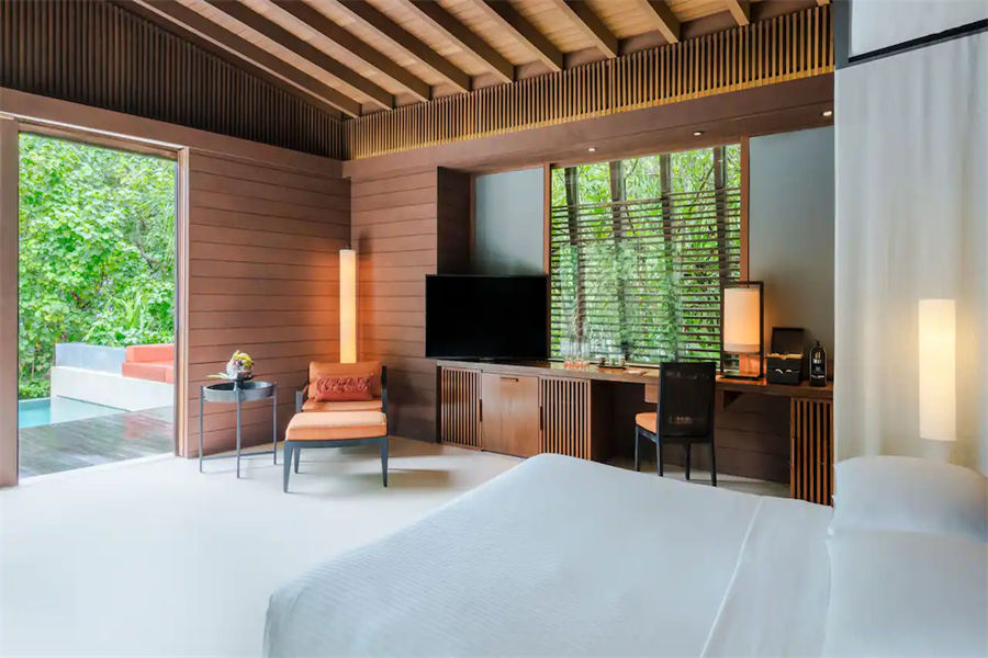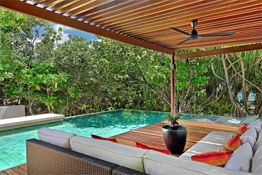房型介绍:全岛19栋的沙滩泳池别墅,面积为180㎡,标配私人泳池。别墅内配有一张特大床、可俯瞰私人瀑布池和露台的躺椅,设有水磨石浴缸的室外和室外淋浴区以及可直通海滩的雨林淋浴区。