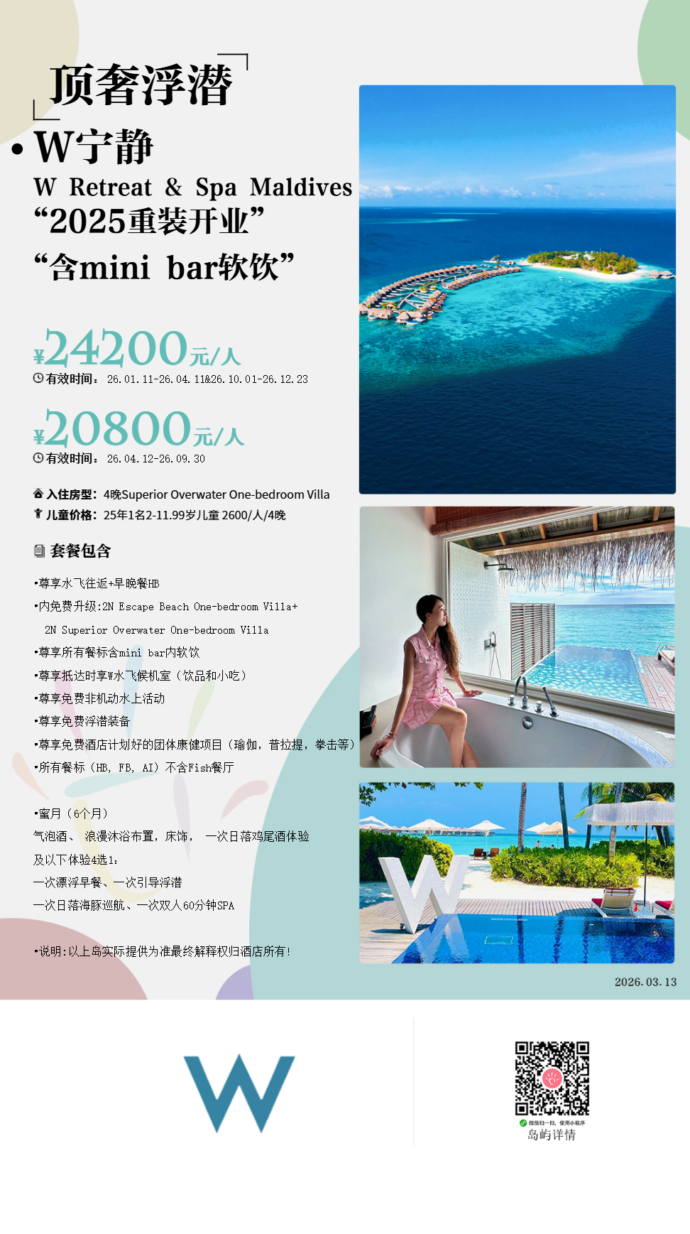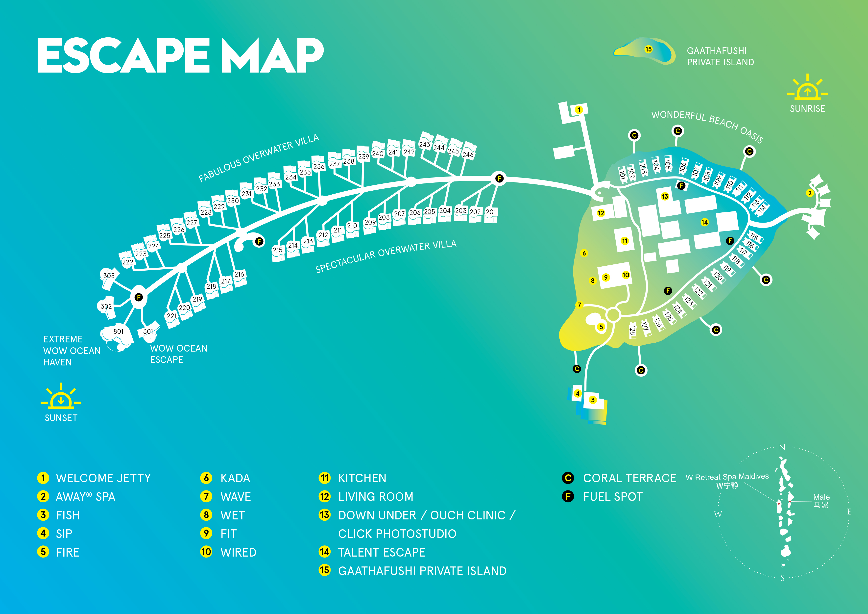 马尔代夫宁静W Retreat & Spa Maldives2006年9月全新开幕,前身为Fesdu Fun Island。该酒店荣获多项奖项,如Travel+Leisure Magazine2007年全球最佳酒店,值得参观的15强酒店,Travel + Leisure Magazine 2007年最佳度假酒店设计奖。W宁静岛坐落于宁静优美的怀斯图岛上,终年阳光明媚,气候宜人,是理想的疗养胜地和水上运动乐园,乘坐水上飞机30分钟即可抵达。作为马尔代夫赫赫有名的奢华岛,它干净而极具梦幻色彩,乘坐水上飞机,从上空看岛屿,你会被海的湛蓝迷倒。降临在宁静岛上,W标志非常明显,因此宁静岛也称W岛。在纯净的沙滩上看日出、日落,享受一份惬意悠然。海钓是件很有趣的事,不管收获的是大鱼还是小鱼,这个过程都会让你觉得很享受。