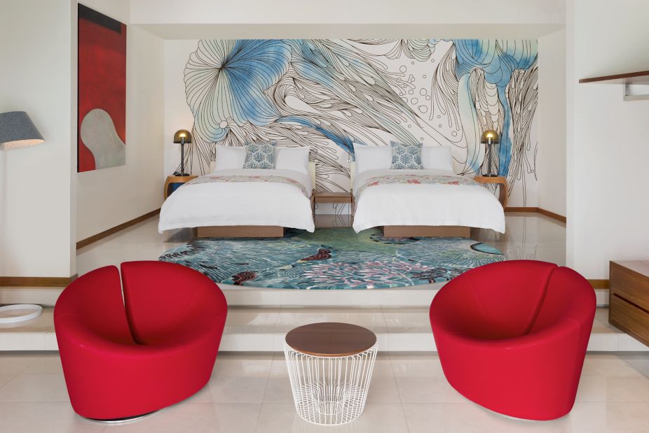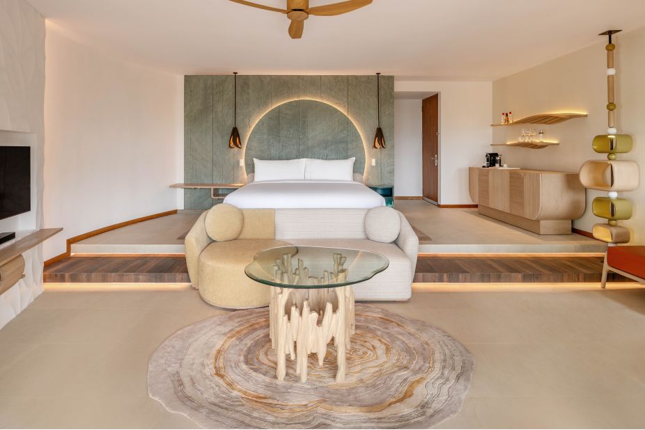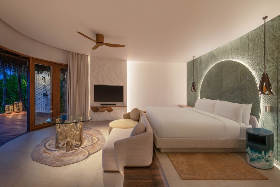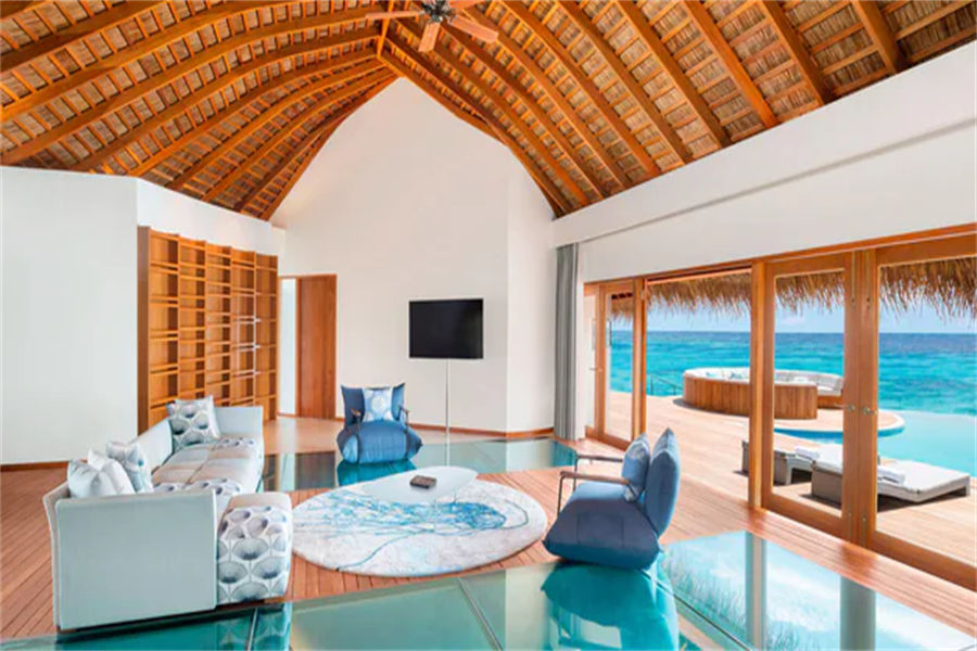 房型介绍:高级水上别墅正位于礁湖之上,是无比奢华的水上幽居之所。您可在阳光露台上享受日光浴。透过玻璃地板观察水下生物,或在您的私人水池中感受阵阵清凉。在时尚的室内空间享受美好生活,这里的装饰灵感来自于当地的海洋生物。
