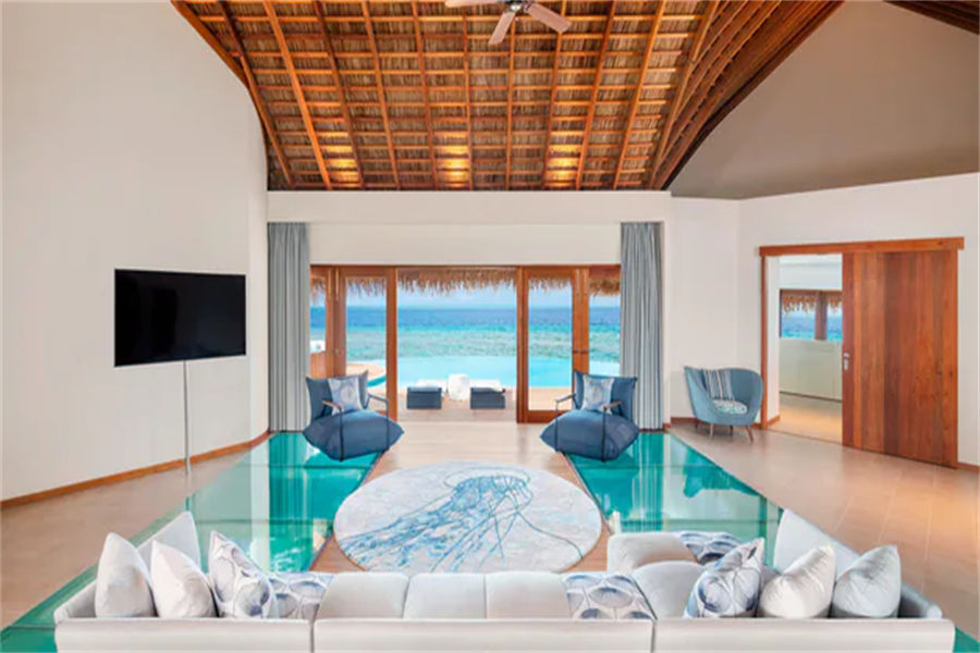 ⑥水上别墅都有玻璃地板,可直接看到水下的珊瑚和鱼
