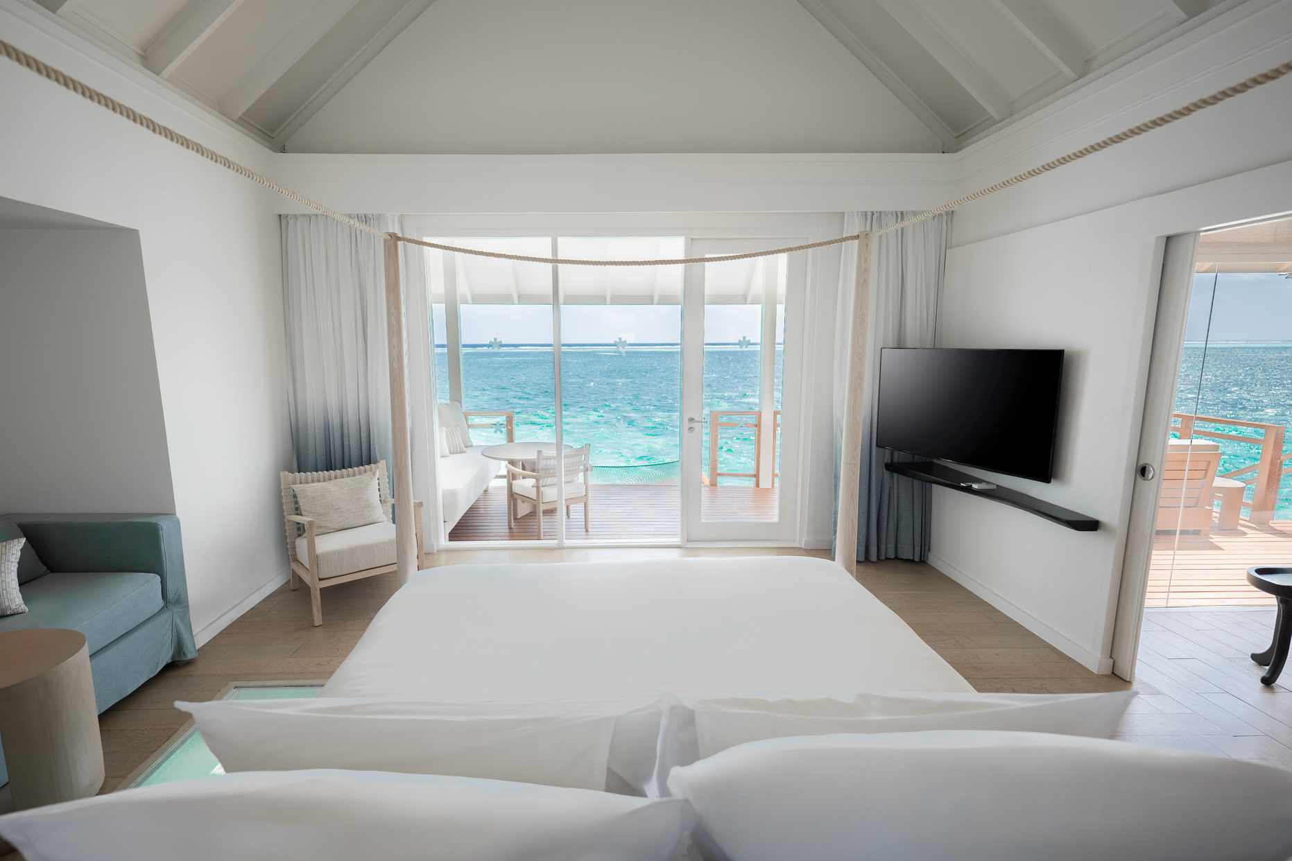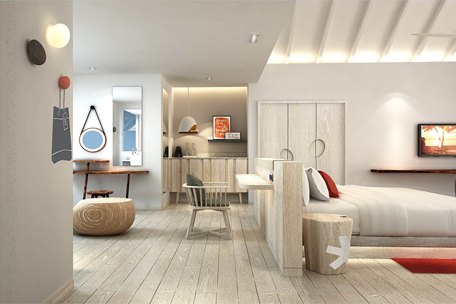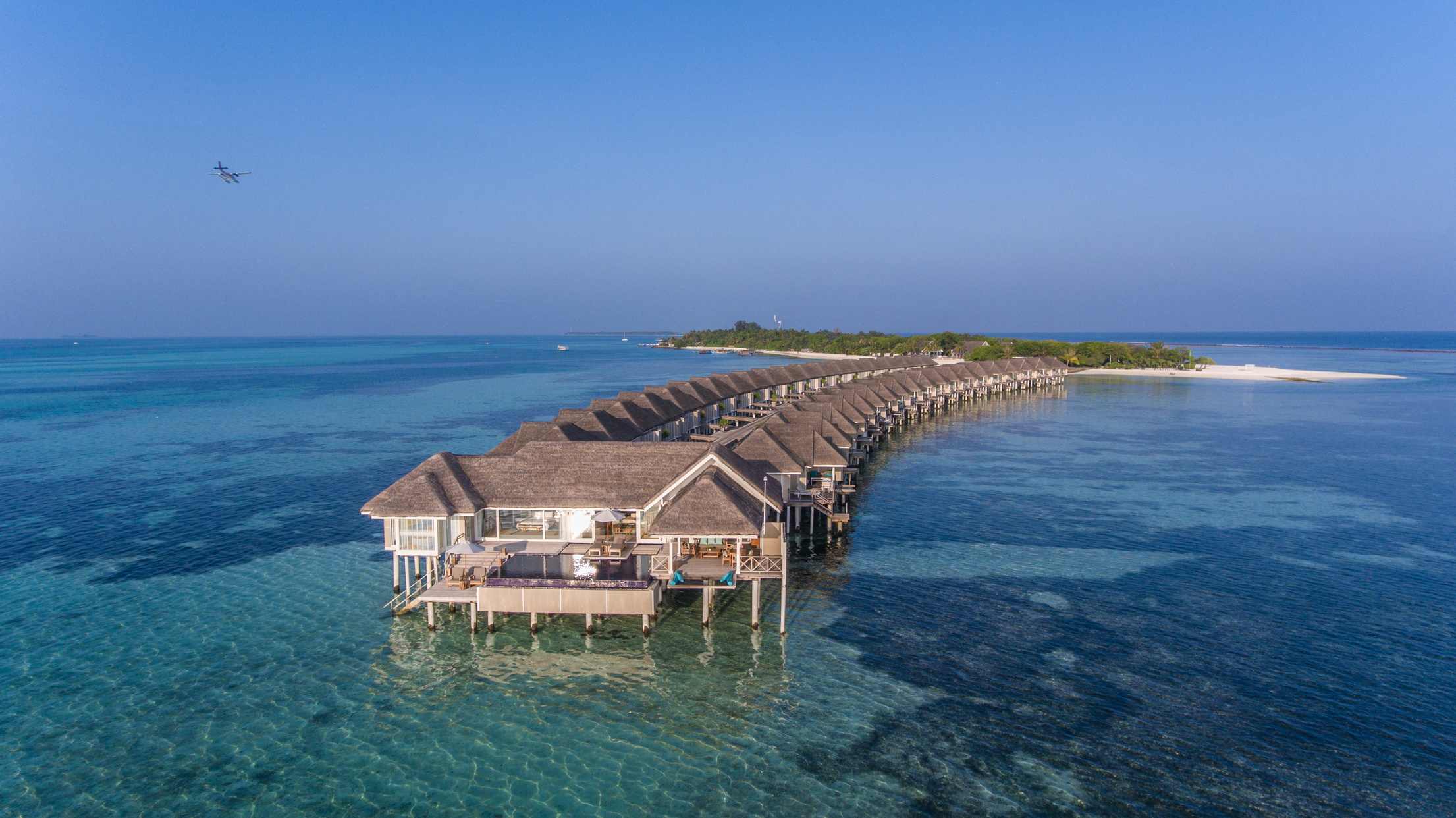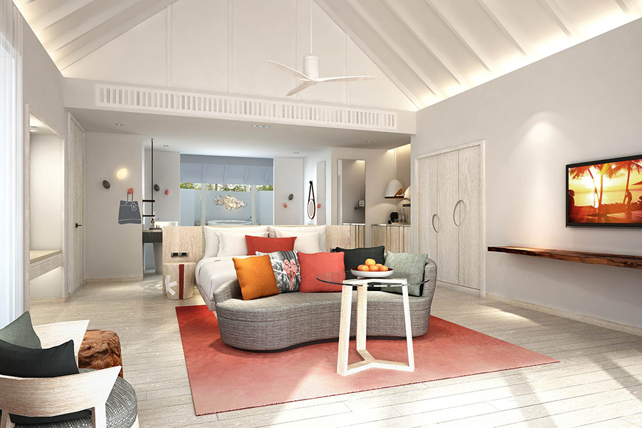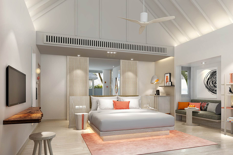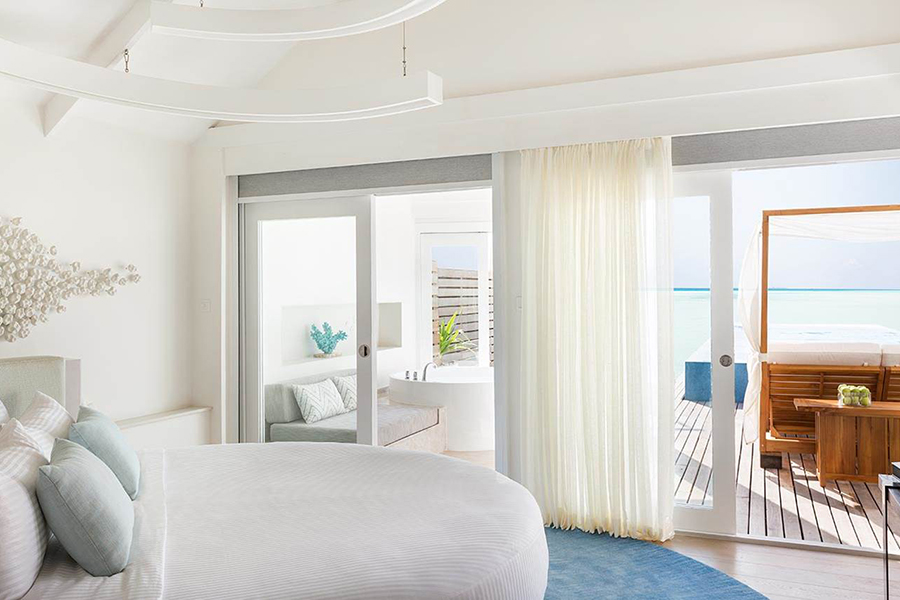 房型介绍:专为夫妻设计,可欣赏印度洋上空无与伦比的日出之景。魅丽水上泳池别墅,占地220平方米,为浪漫而生。客厅区域嵌有海景落地窗,为别墅带来充足的自然光。窗外是宽阔的木甲板露台,可作为餐厅,还有一个小木屋,视野所及之处是一个14米长的无边泳池。内饰方面,淋浴玻璃房,大理石白的按摩浴缸,圆形的大床,床上笼罩着一层轻薄的纱帐,使卧房焕然一新,充满浓浓的现代风。
