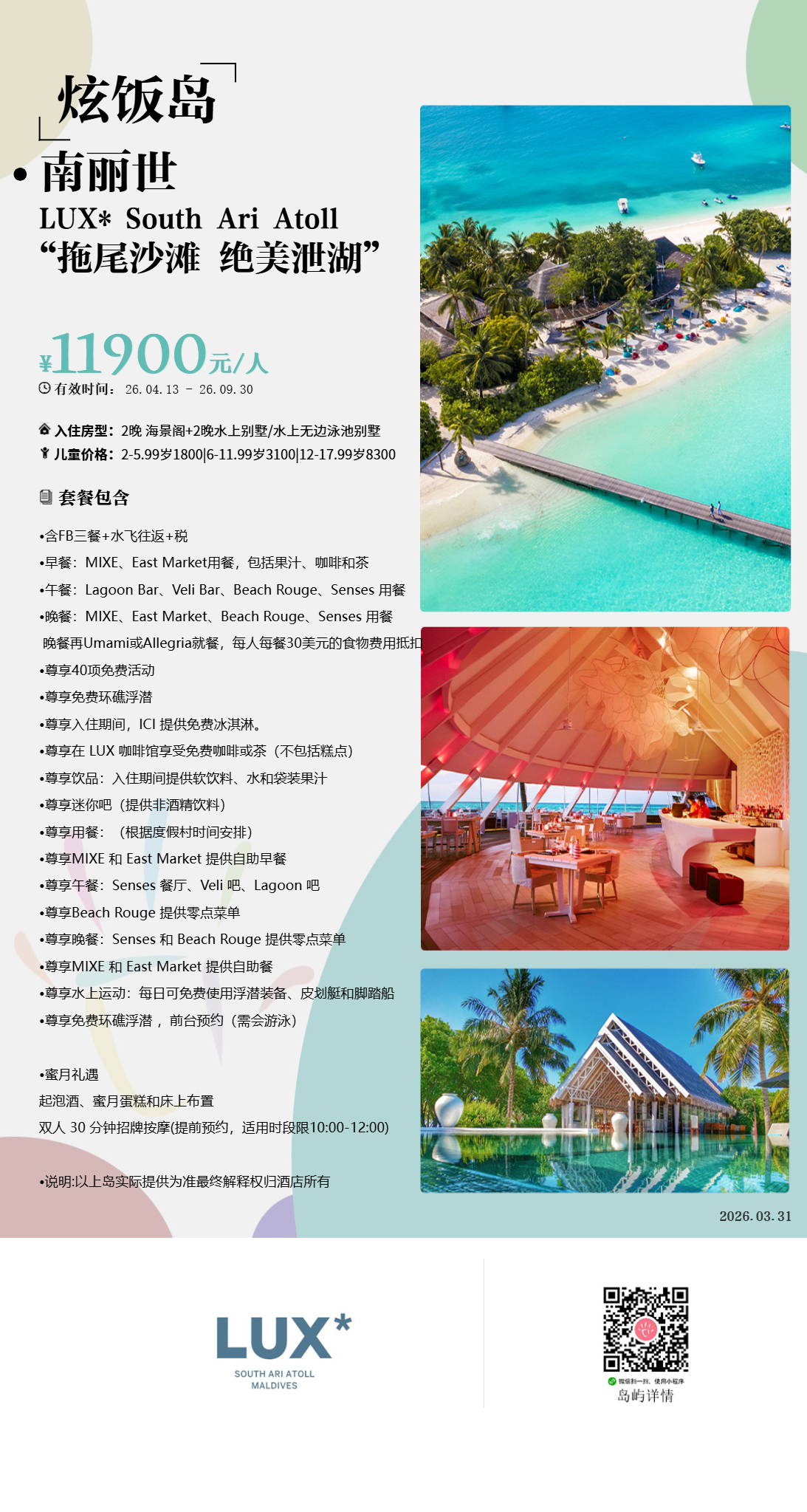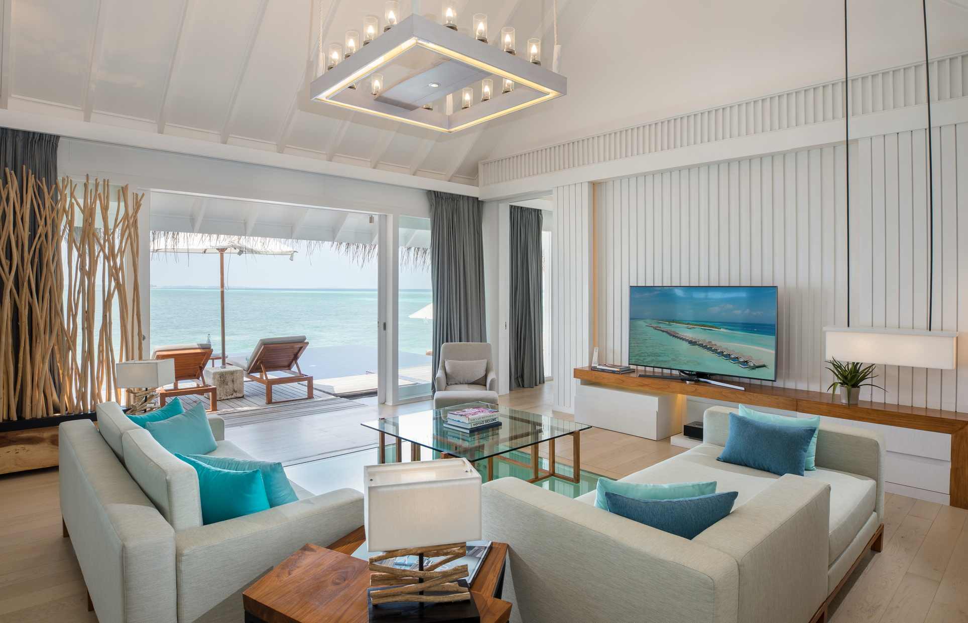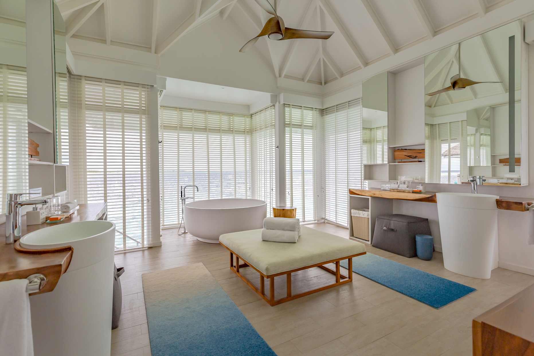 房型介绍:专为夫妻设计,可欣赏印度洋上空无与伦比的日出之景。魅丽水上泳池别墅,占地220平方米,为浪漫而生。客厅区域嵌有海景落地窗,为别墅带来充足的自然光。窗外是宽阔的木甲板露台,可作为餐厅,还有一个小木屋,视野所及之处是一个14米长的无边泳池。内饰方面,淋浴玻璃房,大理石白的按摩浴缸,圆形的大床,床上笼罩着一层轻薄的纱帐,使卧房焕然一新,充满浓浓的现代风。