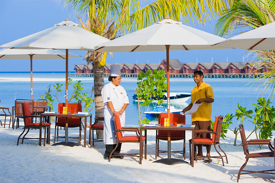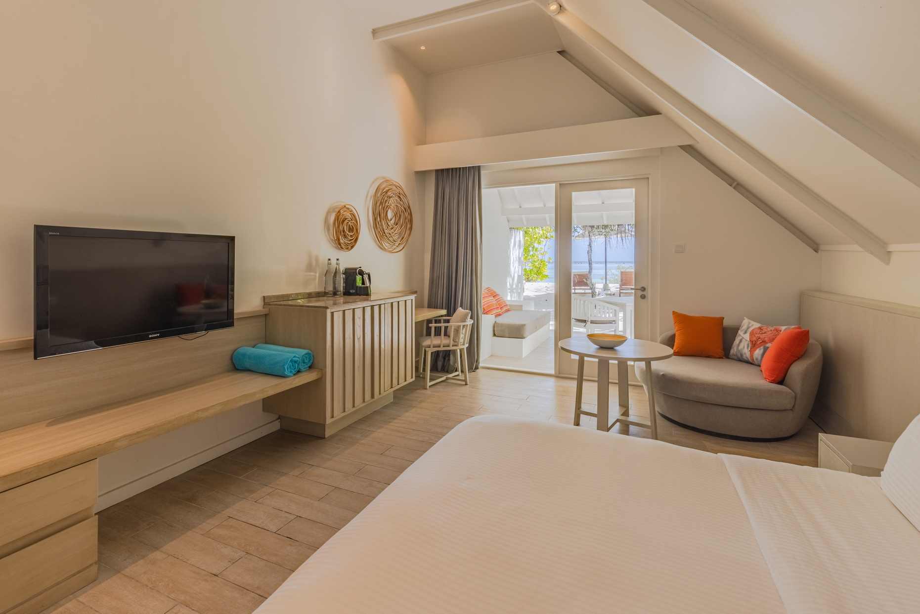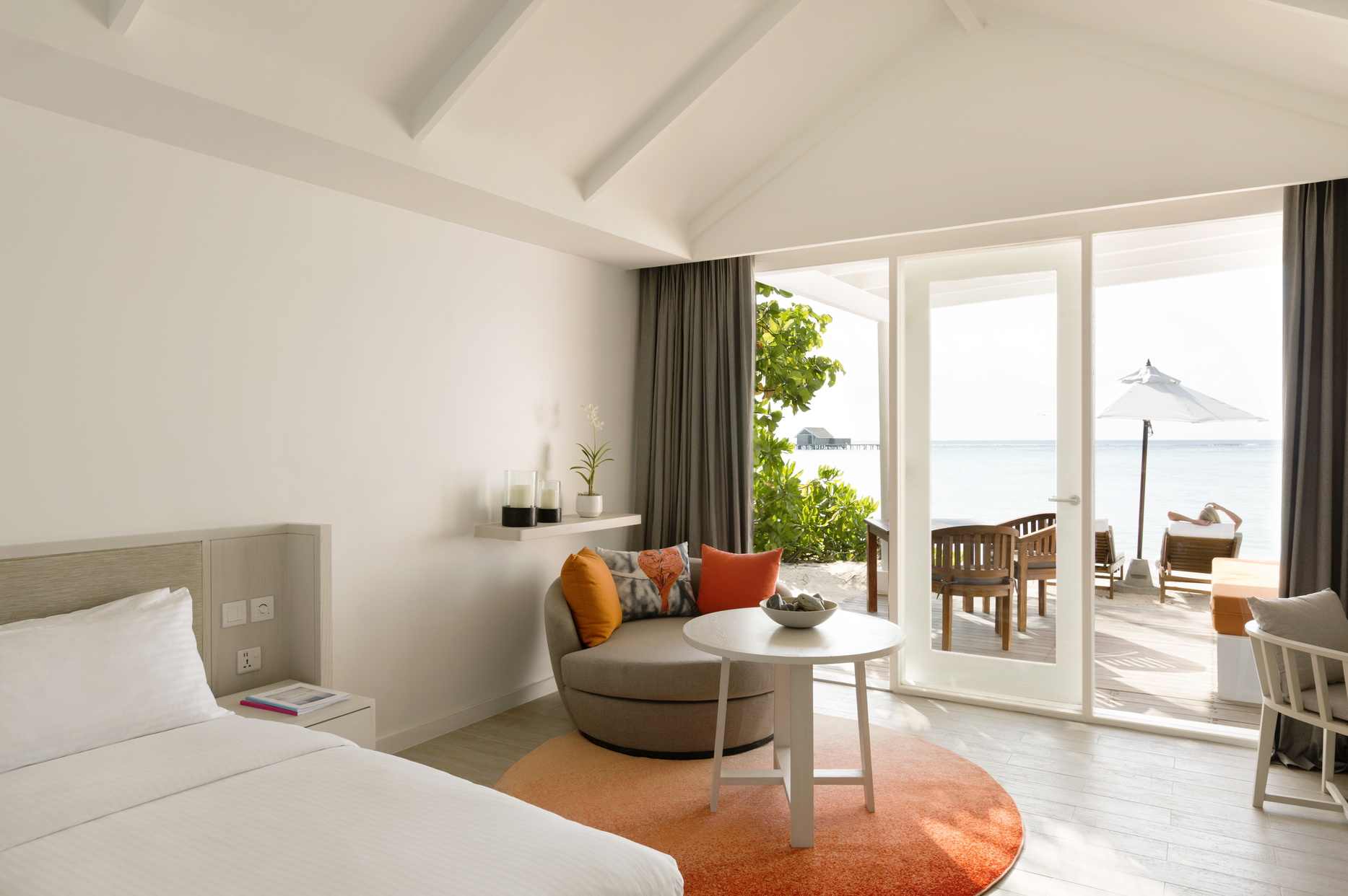 房型介绍:从露台上能看到美丽的岛屿以及纯白色的沙滩,房间拥有淡橘黄色调的精妙装饰与潮起潮落遥相呼应。所有的客房都有配套的露天浴室,一望无际的天空、鲜艳夺目的木槿花、迷人的香蕉树,这一切成就了自然环境中的私密空间。每间海滩别墅都有足够的空间,能接待两个成年人和一名青少年或儿童。