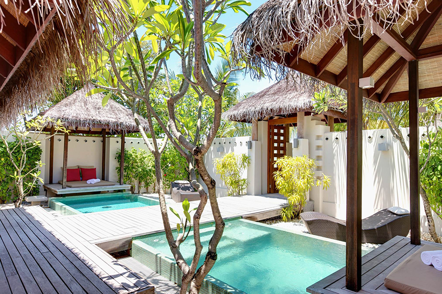 房型介绍:海滩泳池别墅独立宽敞,可以欣赏远处环礁湖的绝美景色。浅色调的沙滩,彰显出岛内居住环境的自然魅力,而私人露台则呈现出室外的奢华生活。所有的客房都有配套的浴室,通往私人花园,自带淋浴和独立浴室。在私密花园里休息放松,尽享泳池、甲板、太阳椅和露天淋浴,清爽宜人。