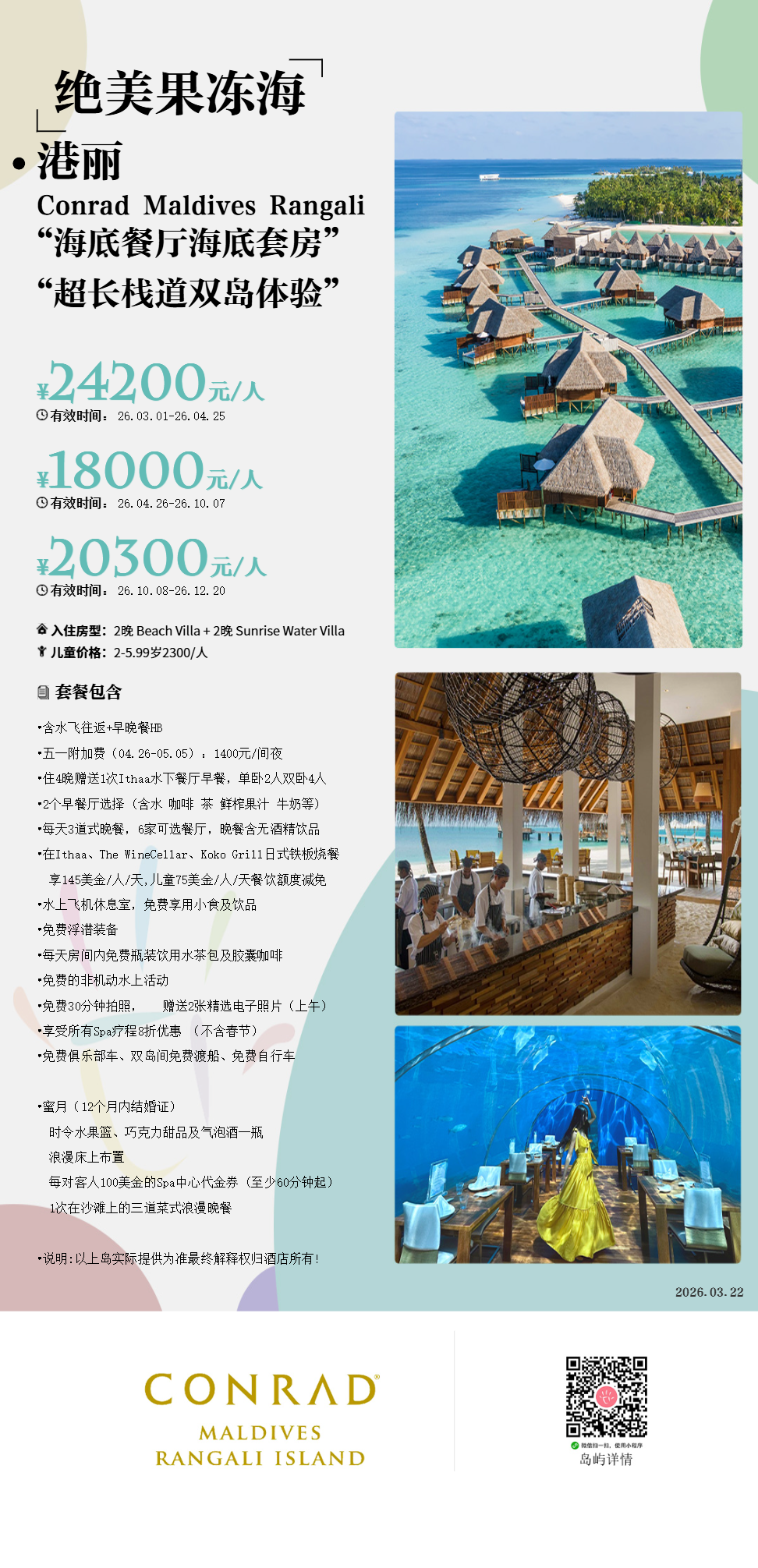 马尔代夫港丽Conrad Maldives Rangali lsland,荣获全球最佳水上别墅、全球最佳套房、马尔代夫最佳水疗度假酒店、等殊荣的六星级马尔代夫伦格里岛康莱德酒店,为宾客呈现极致马尔代夫假日风情,奢华格调与质朴享受在此完美交融。 酒店拥有两座岛屿,带来三种不同风格的度假体验。首先在小小的伦格里岛上,马尔代夫式的世外桃源将让宾客无比沉醉。而走过一座500米长的桥,即到达面积更大、更显活力的主岛,这里丰富齐全的设施让宾客尽享更多便利与乐趣。然后在离主岛100米的碧波之上,是我们酒店中的Spa Retreat 水疗区,您可在这座世外桃源中的桃源尊享我们为您带来的第三种忘我体验。伦格里岛酒店率先打造了凌驾于礁湖之上的水上别墅,并设有海底餐厅Ithaa,这些创举令酒店广受追捧与赞誉。酒店还开设了马尔代夫第一家奶酪红酒吧。知名主厨Jereme Leung 执掌的 Ufaa 餐厅与酒店其它 10家获奖餐厅和酒吧互为补充,各具特色。酒店的两家水疗中心提供舒缓放松与精彩焕活的体验,其中一家水疗中心屹立在海面之上并配有玻璃地板护理室。更可观赏各种珍稀海洋生物。这一切让马尔代夫伦格里岛康莱德酒店成为全球高端的岛屿目的地。