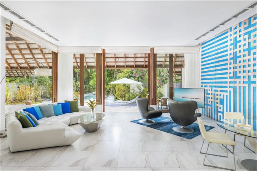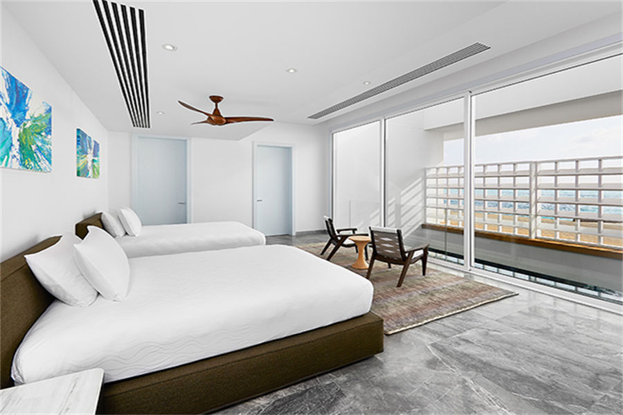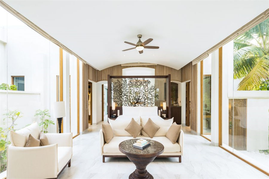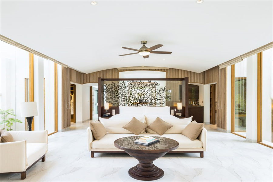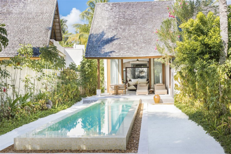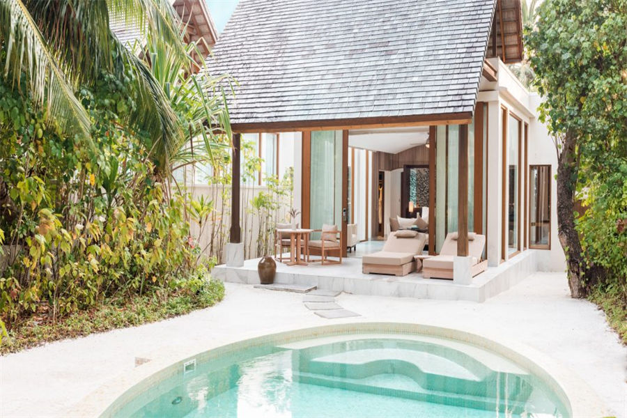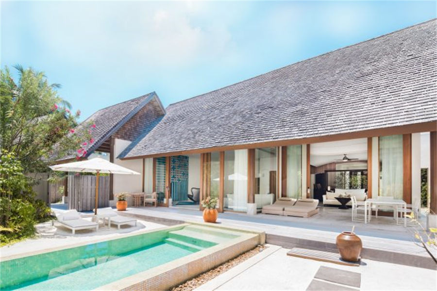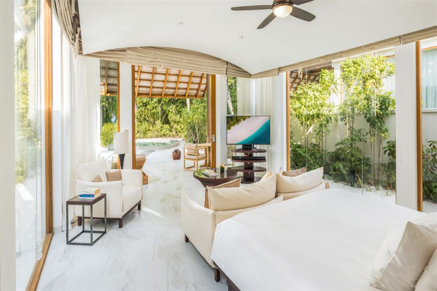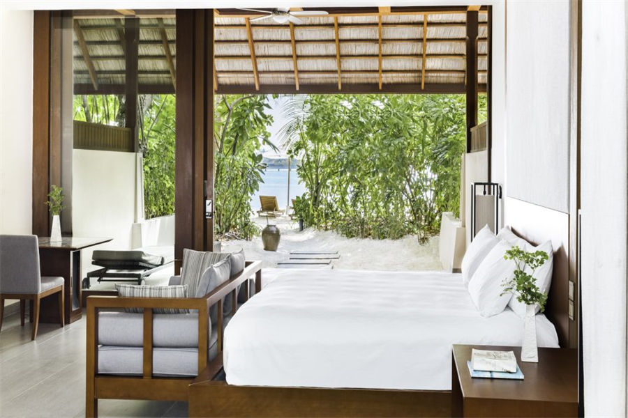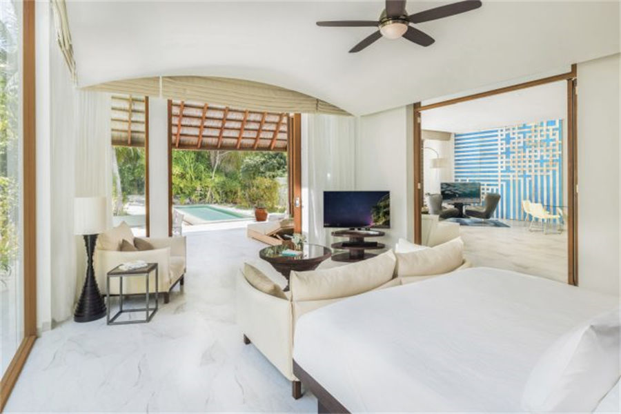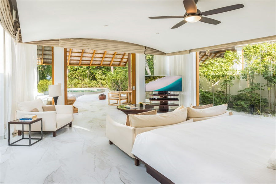 房型介绍:2套三卧沙滩泳池套房面积668㎡,是岛上最大也是最私密的套房,套房拥有两个卧室、两个露天卧室、两个私密小型健身泳池、一个风格高雅的公共区域,并可以直达海滩。宾客可以在各自的私人露台上休闲,也可以在绿意环绕的泳池边放松。在这一充满情致所在的另一边,是白色沙滩和海龟水域。