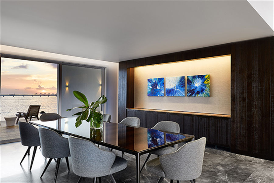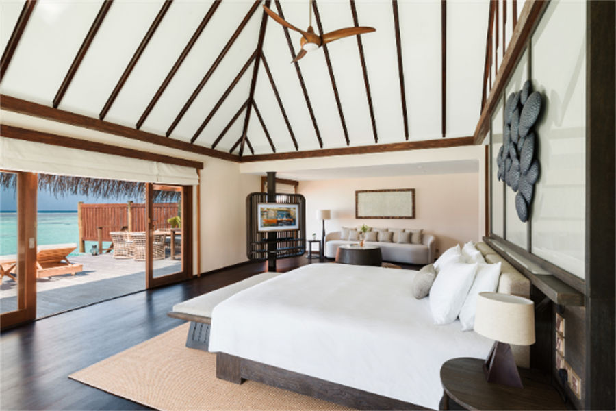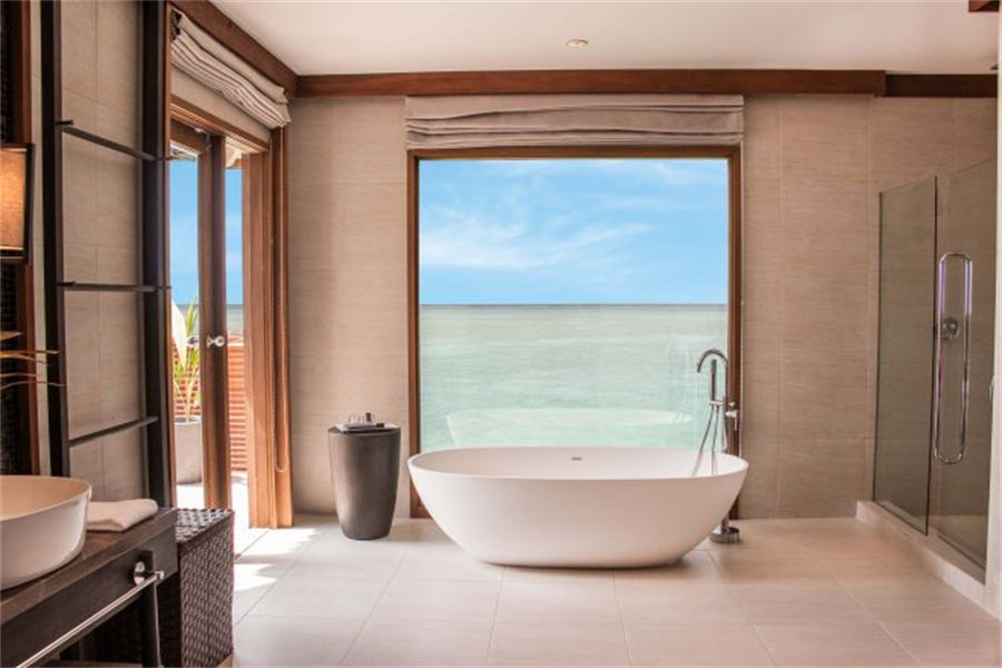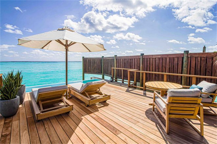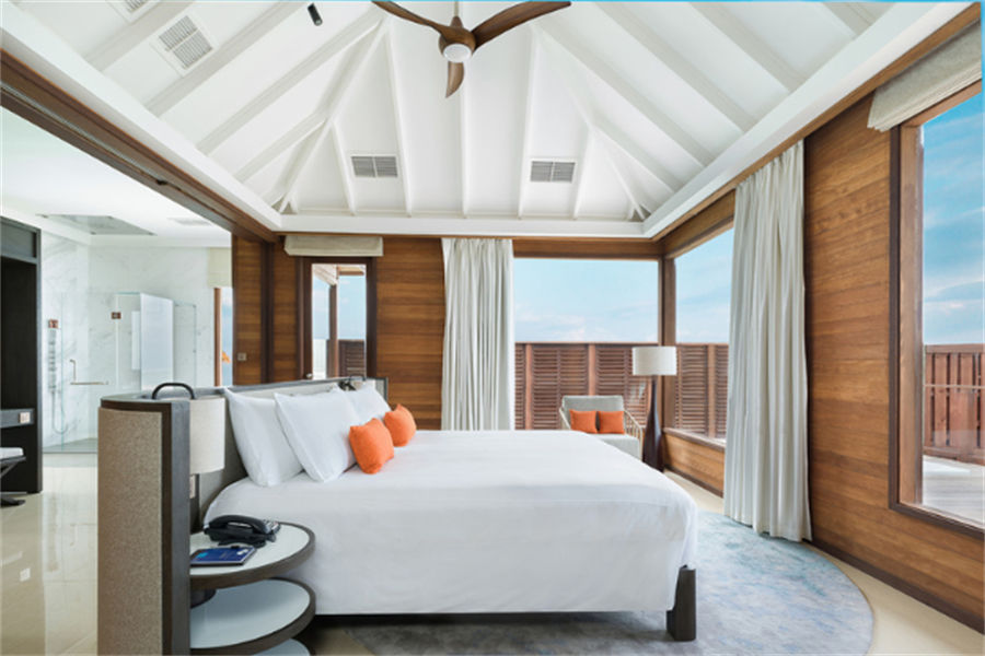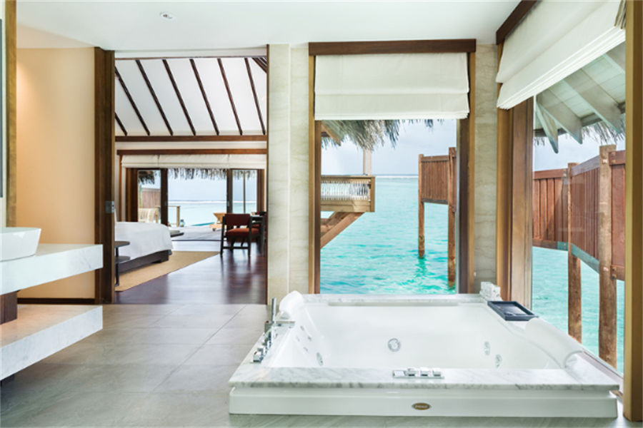 房型介绍:6栋至尊水上别墅面积150㎡。距离主岛有100米的距离,非常适合度蜜月,提供浪漫岛屿生活的所有奢侈享受。您可以在私人日光浴平台上休息,台阶直接通向下面的水晶海洋,或在按摩浴缸中放松身心,欣赏一览无余的地平线美景。