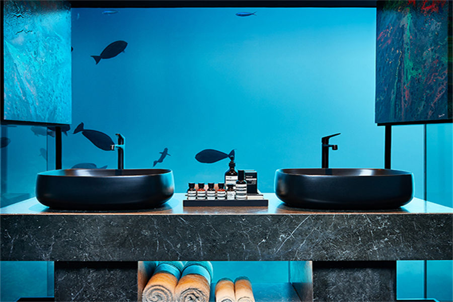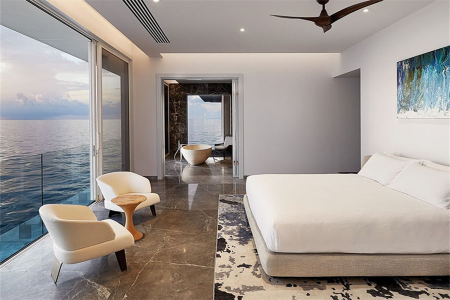 房型介绍:这栋两层三卧室住宅奇迹般地坐落于印度洋海面之上和海面之下,是现代设计与技术的杰作。也是马尔代夫的瑰宝,让人无限遐想。海底套房设有特大号卧室,客厅,浴室和通往上层客厅的螺旋楼梯。海底卧室楼层位于海平面以下五米处,可提供周围海洋环境的不间断视野。上层设有一个双人卧室,浴室,化妆间,健身房,管家宿舍,私人保安室,综合客厅,厨房,酒吧和餐厅,其中有一个甲板特意面向日落方向,以获得最佳观景点。在别墅的另一面则是面向日出方向的休闲甲板,并配有无边泳池。上层还包括一个额外的特大号床卧室和浴室,拥有一个精心布置的朝海浴缸,非常适合浸泡在无尽的地平线上。