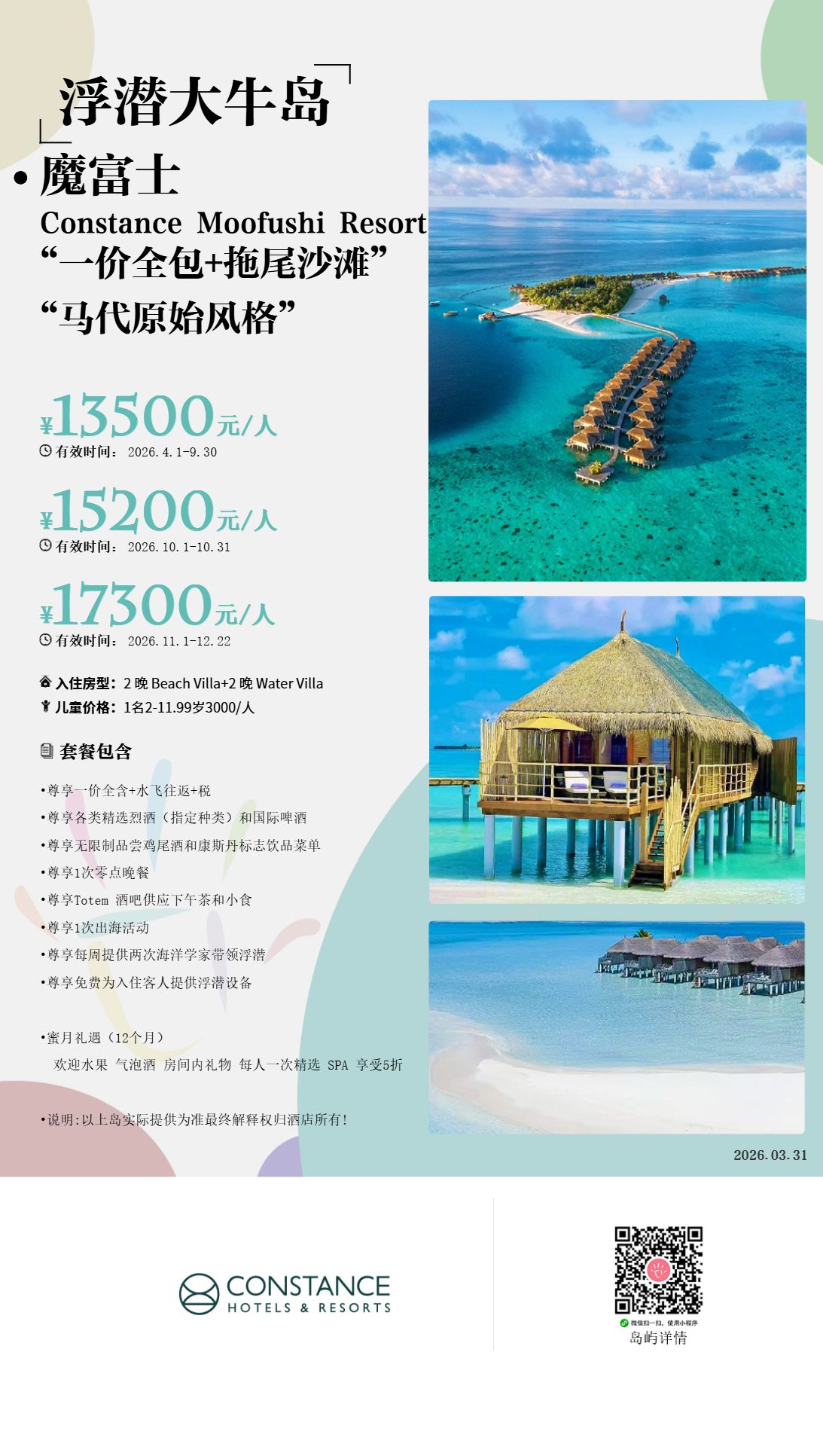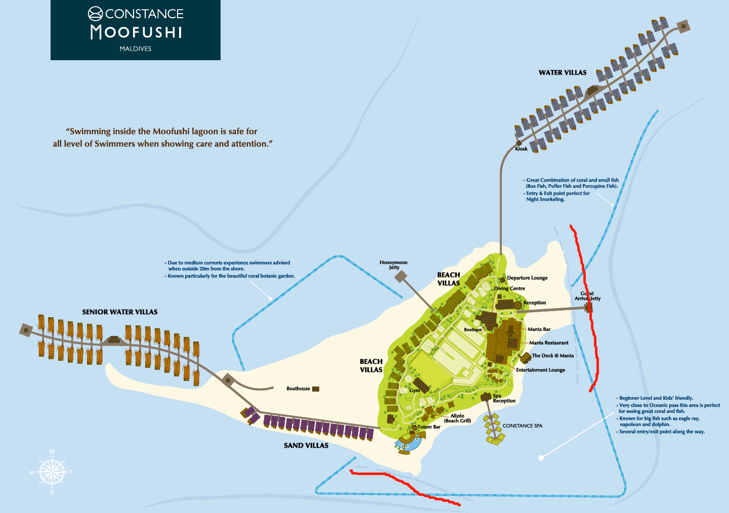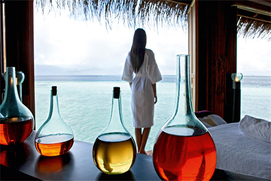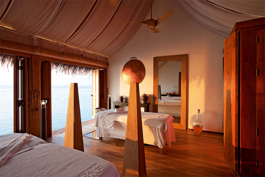 马尔代夫魔富士Constance Moofushi Resort Maldives,岛比较小,环岛步行十分钟左右,岛屿浮潜环境很好。于2010年11月1日装修完毕全新开幕,酒店翻新了老的沙滩屋,并重新建造了很多水上屋,沙屋只有24间沙屋,更多的保存了原生态,面积不大,水屋稍大,特别是豪水比较突出,接近100平米,主要是超大的露台,带来更好的景色,以及后院悬空在海上的浴缸上。所有房间都是原木风格,细节处做得非常精细,连梳妆台都是个小钢琴的样子。
