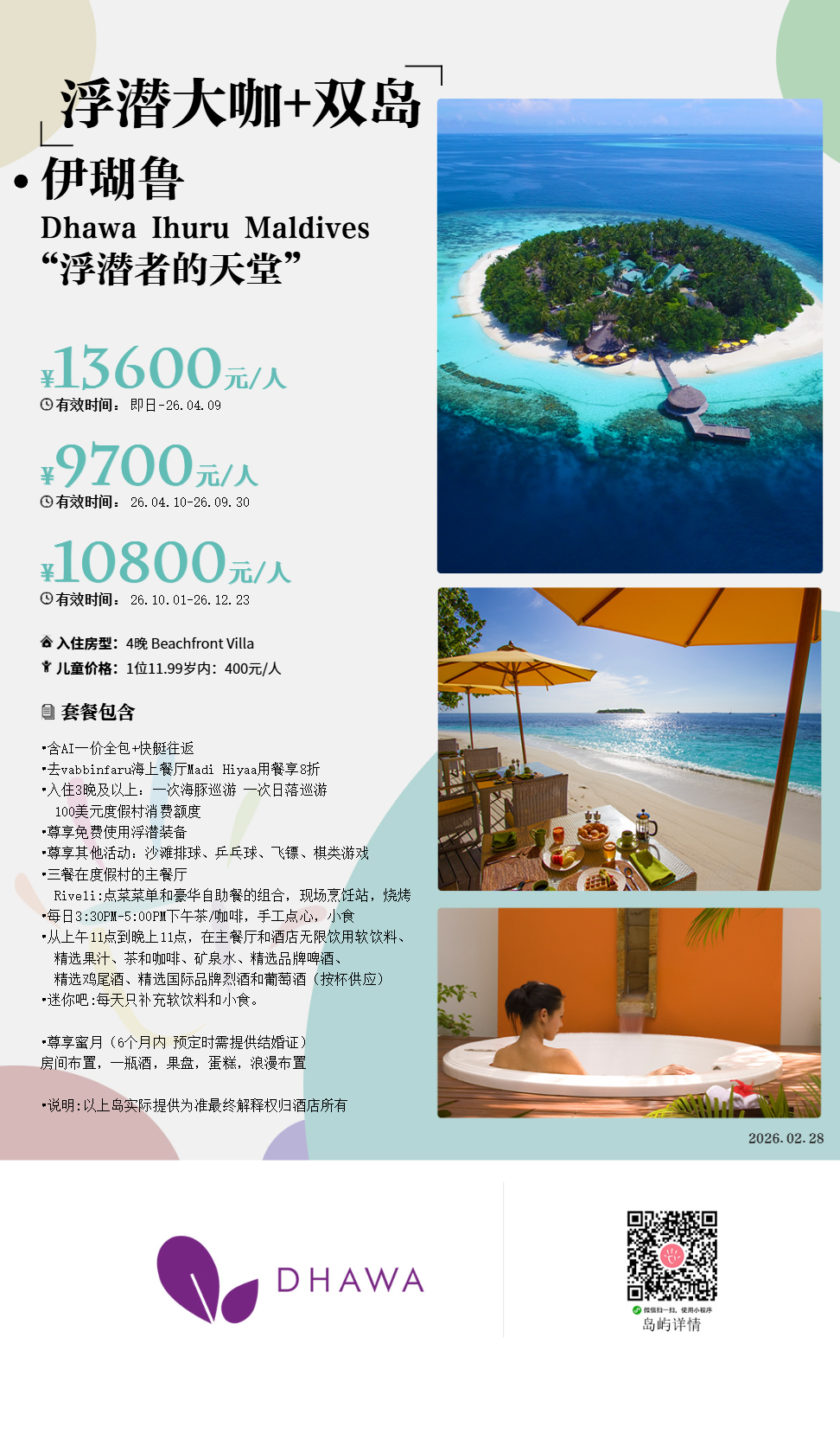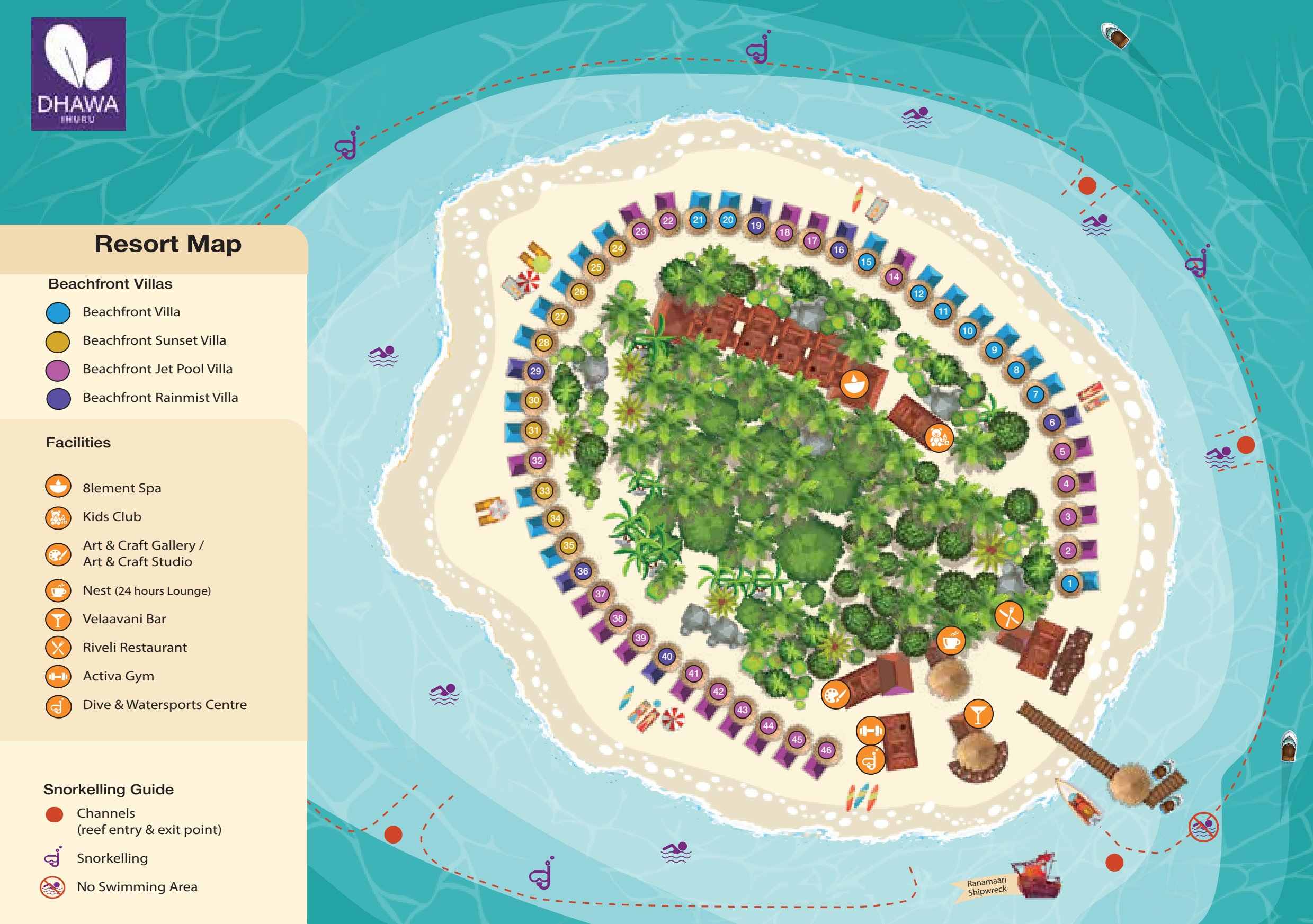 马尔代夫伊瑚鲁Dhawa Ihuru Maldives,坐落在北环礁,从马累国际机场乘坐快艇20分钟即可抵达这一休闲度假胜地,远离日常工作,追逐内心的宁静平和。四周环绕着水晶般清澈见底的蔚蓝海水、白沙迤逦的海滩、美不胜收的日落美金、轻松惬意的氛围,您有什么理由不选择伊瑚鲁呢?曾经隶属于悦榕庄悦椿,现在划归为子品牌Dhawa悦苑,一定会展现出更有朝气的未来。和悦榕庄瓦宾法鲁紧邻,2个岛屿都是纯沙滩别墅,保障了珊瑚礁和浮潜环境,并且双岛之间每隔15分钟就有多尼船往返,完美实现双岛游,住1个岛,享受2个岛硬件设施和服务,收获双份快乐,真的太赚了。岛屿周围是一圈珊瑚礁,所以为了防止刮伤,可以通过5条浮潜通道进行探索。而儿童仅仅只需要付便宜的快艇交通,真的是多次前往马代的不二选择!