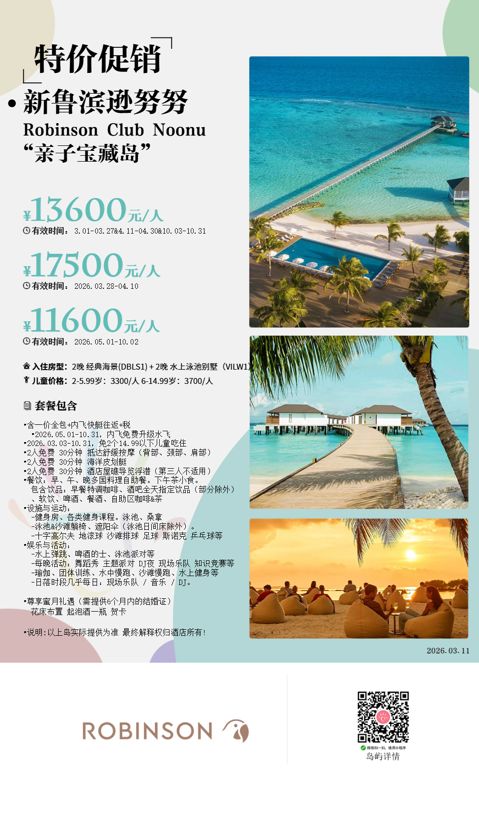 马尔代夫新鲁滨逊努努Robinson Noonu,是大名鼎鼎的SUN集团在马尔代夫最奢华的度假村,一价全包(SSP)酒店。曾经不接待儿童专属蜜月岛,2022年开始允许接待儿童。作为SUN集团第四家度假村拥有最佳泄湖,乘坐水上飞机35分钟即可到达。岛上总共150栋别墅,设施整体较新,均为轻奢时尚风,茅草屋顶搭配丰富的的色调非常出片,并且全部房型均带私人泳池。因为属于一价全包计划,三餐和酒水均包含了,针对中国市场也非常用心,经常赠送漂浮早餐和出海活动,是一家非常省心的度假村。