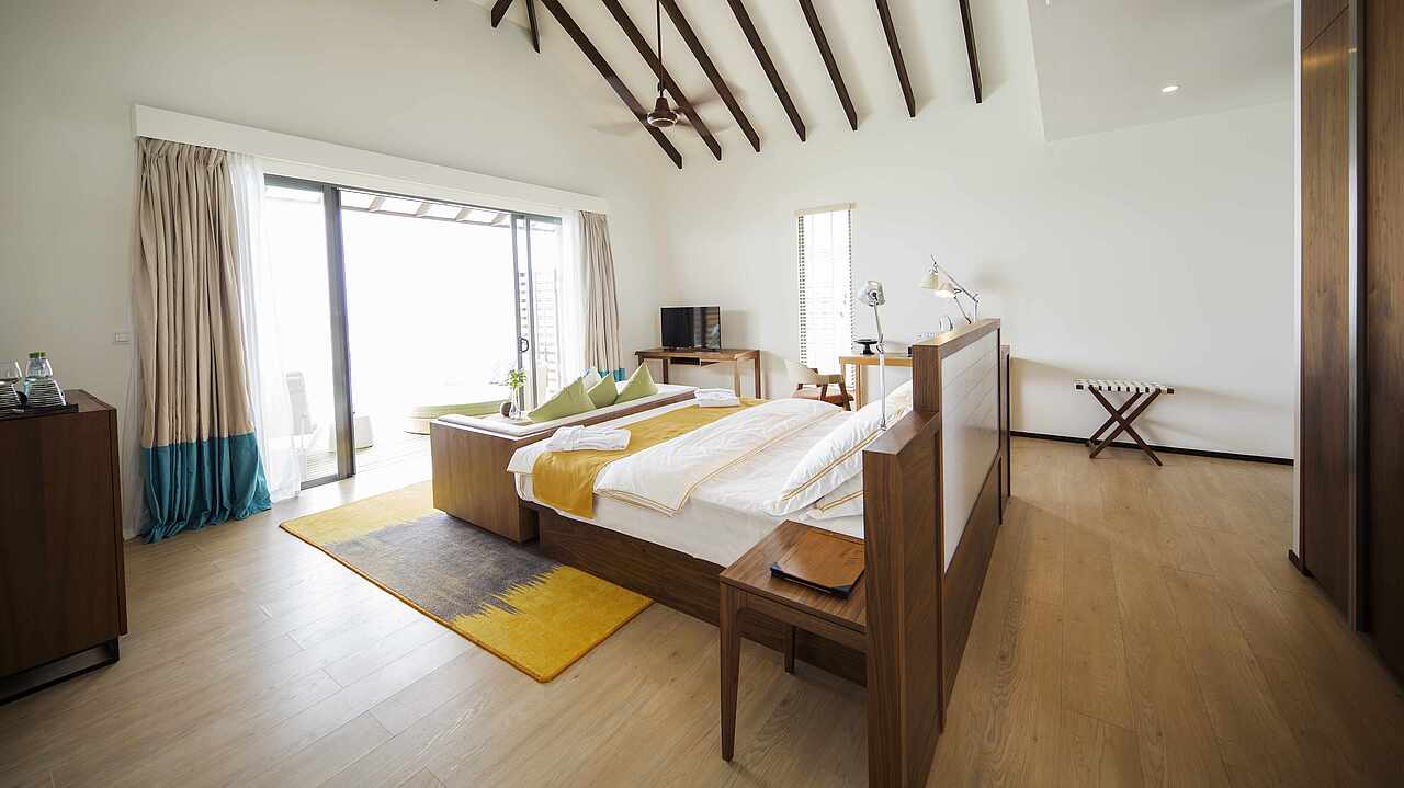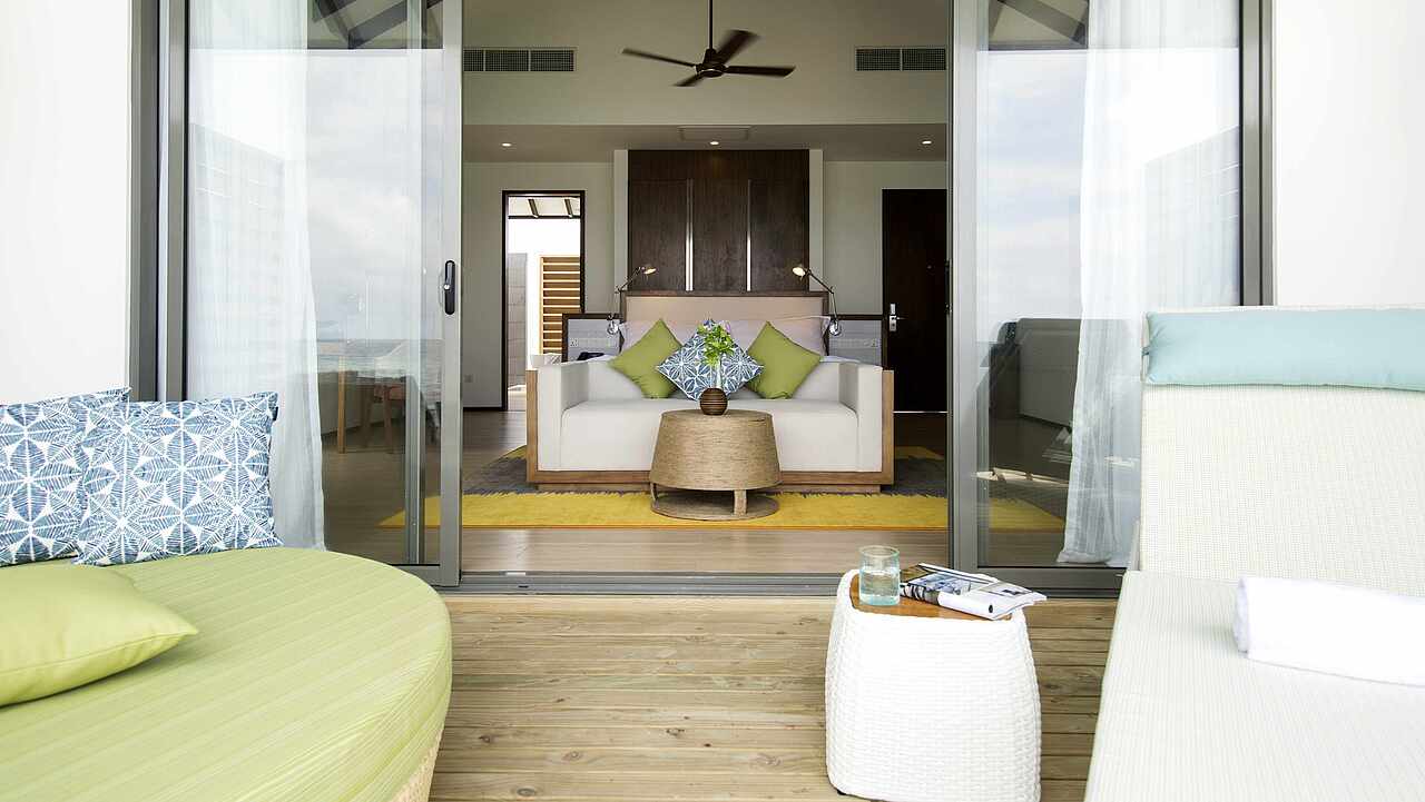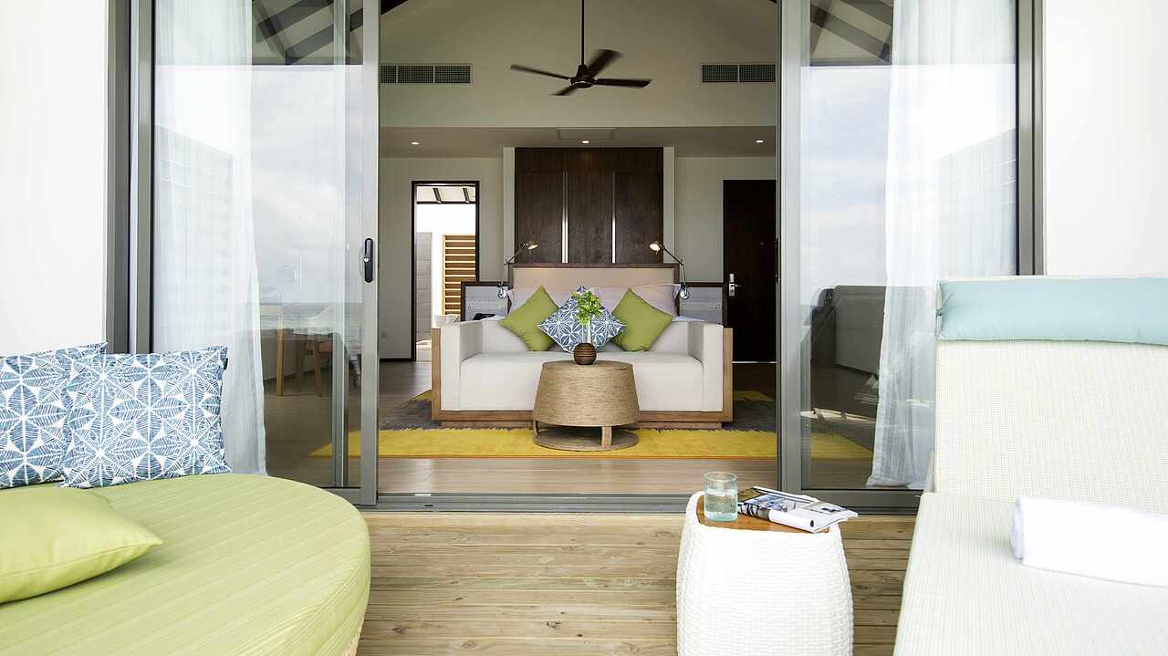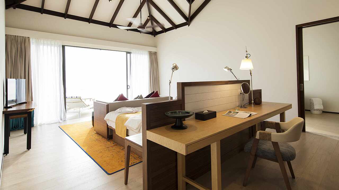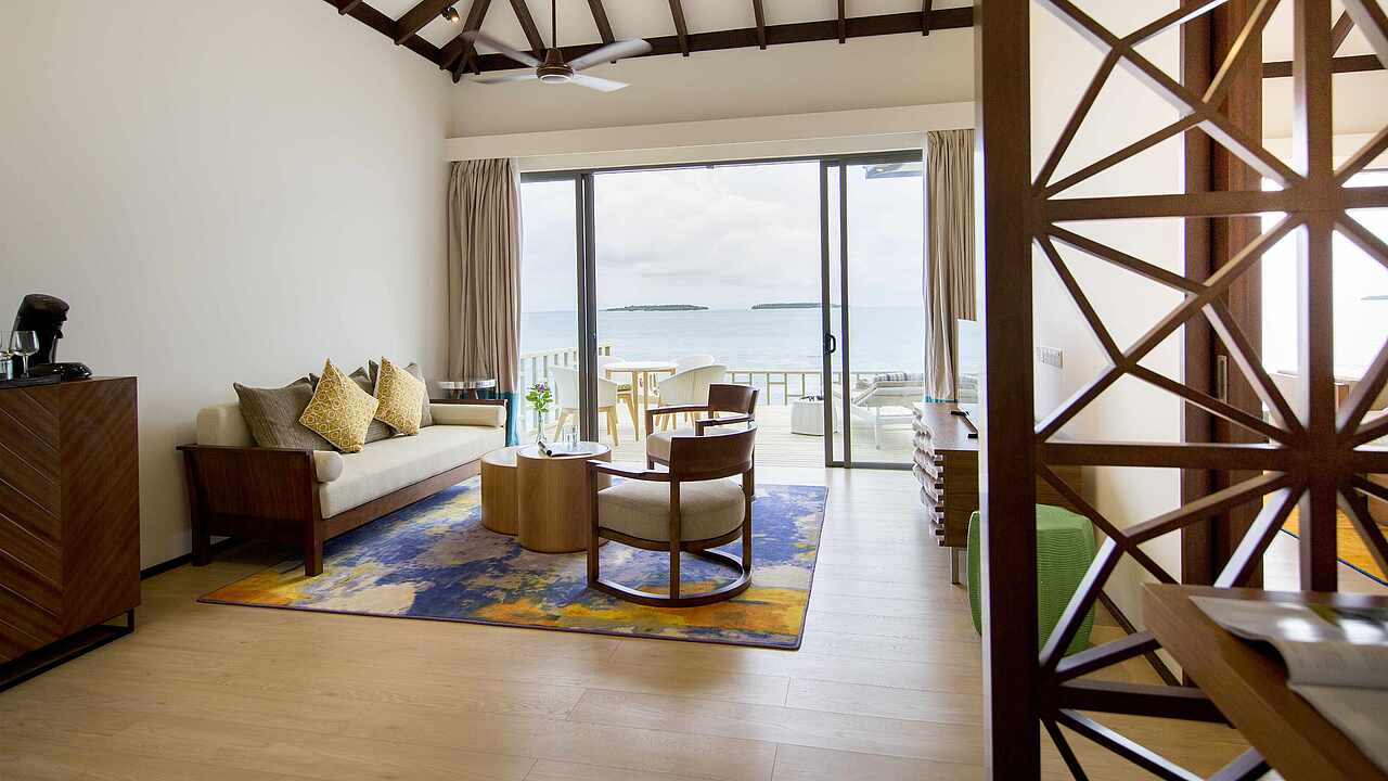 房型介绍:总统套房位于所有水屋的尽头,可以欣赏到完全无遮挡的海景、日出及日落。可以随时下水浮潜、体验大海,出于安全考虑,建议9岁及以上儿童入住。