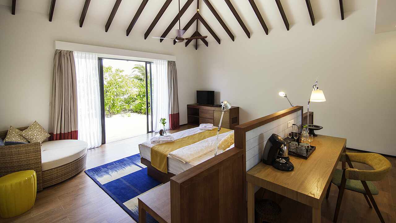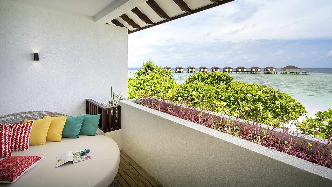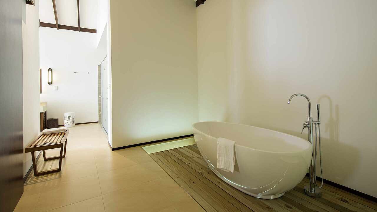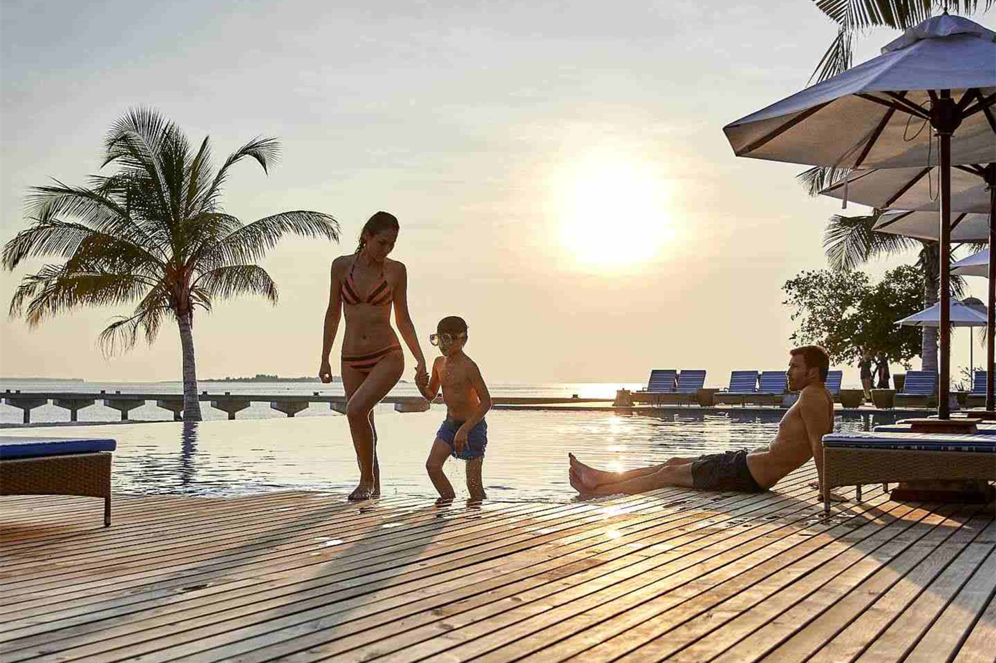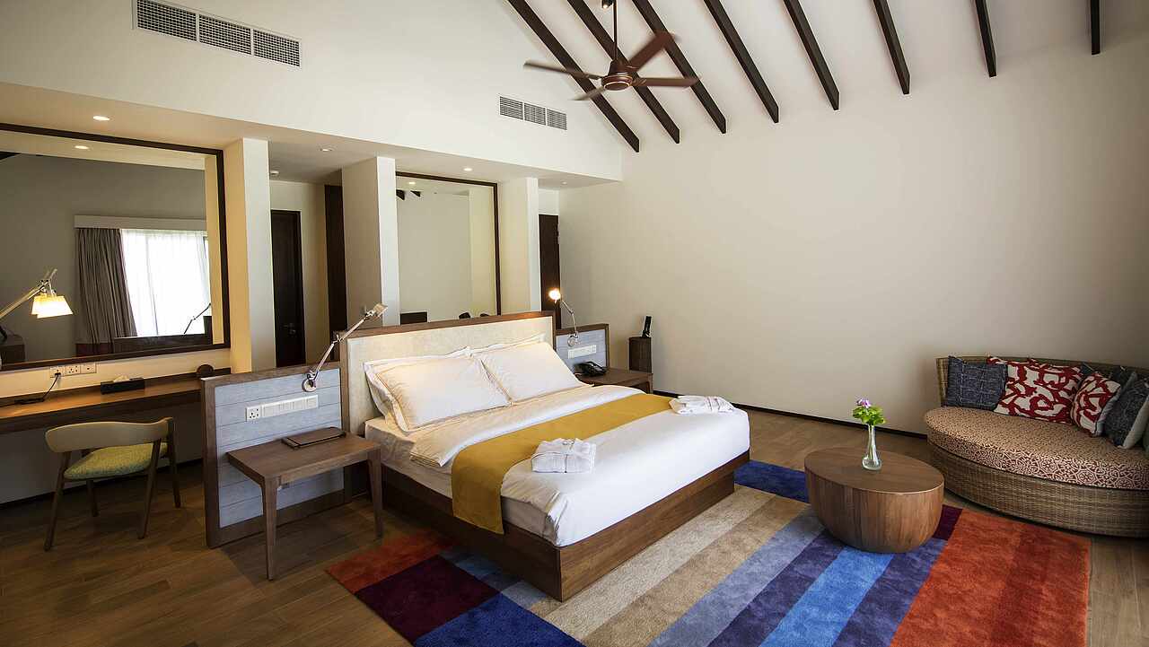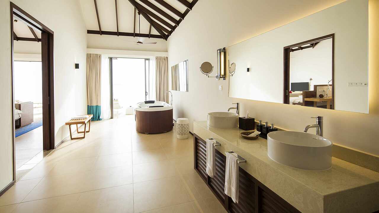 房型介绍:总统套房位于所有水屋的尽头,可以欣赏到完全无遮挡的海景、日出及日落。可以随时下水浮潜、体验大海,出于安全考虑,建议9岁及以上儿童入住。