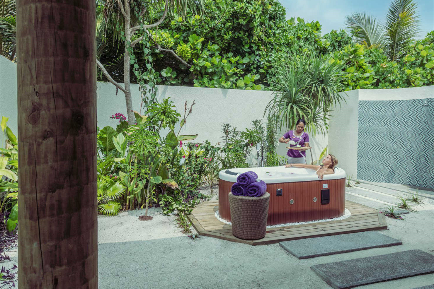 房型介绍:建立在码头的泻湖上,可以欣赏到海景,可以随时下水浮潜、玩水,因此建议9岁以上儿童入住。拥有1张双人床,1张沙发床(100x200厘米),1张可折叠床(90x180厘米),婴儿床(含),露台配备日光浴床、座椅和私人泳池(尺寸:200x410厘米,深度:120厘米)。