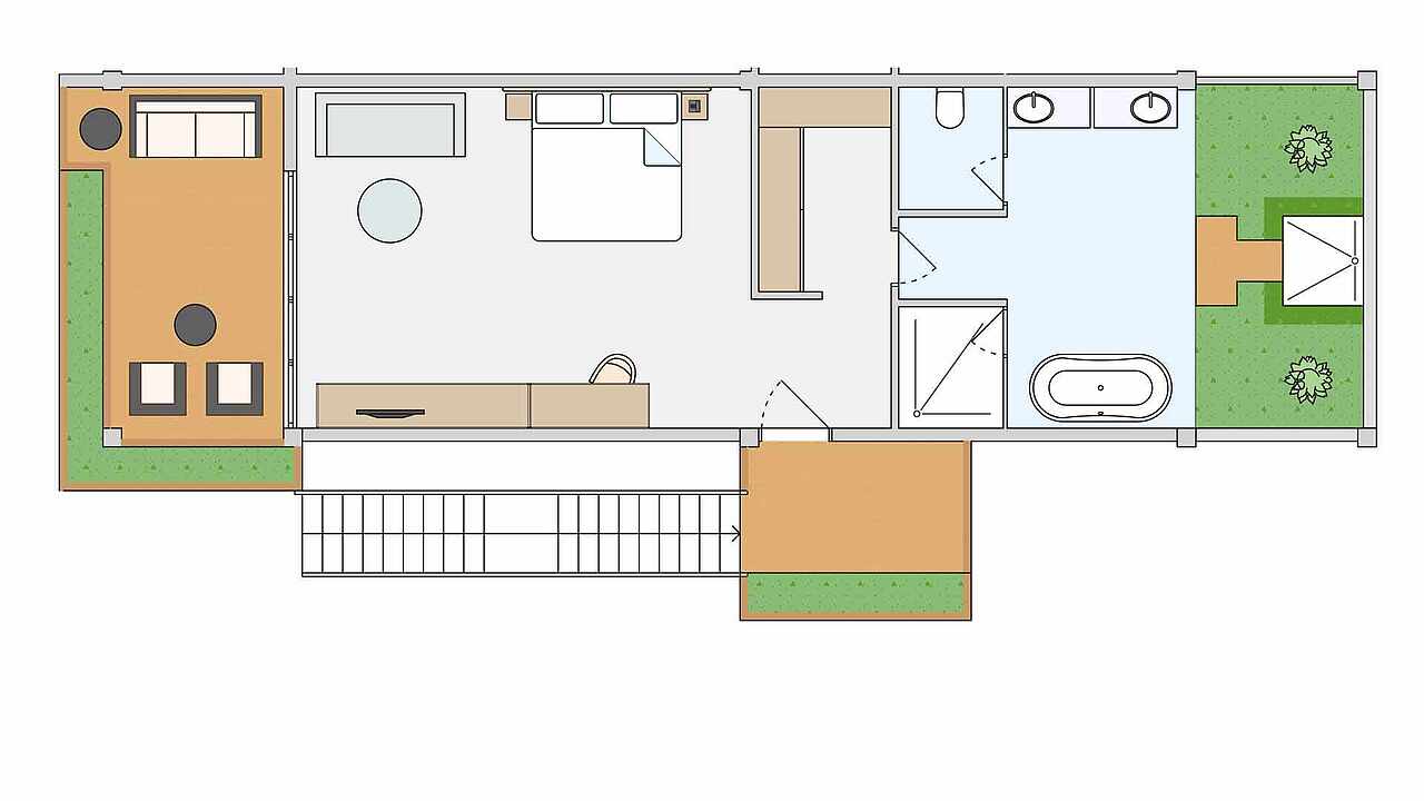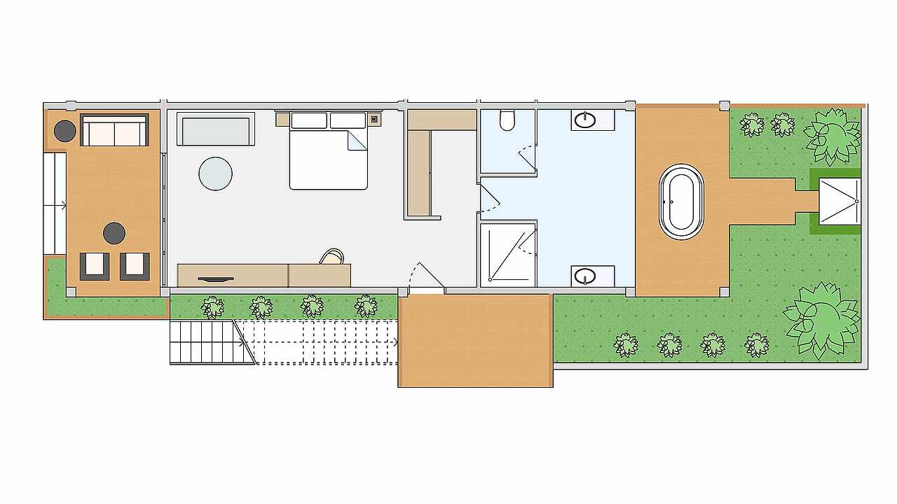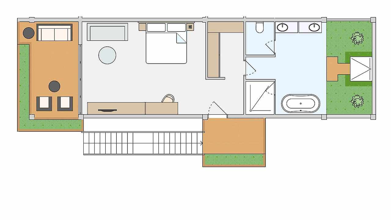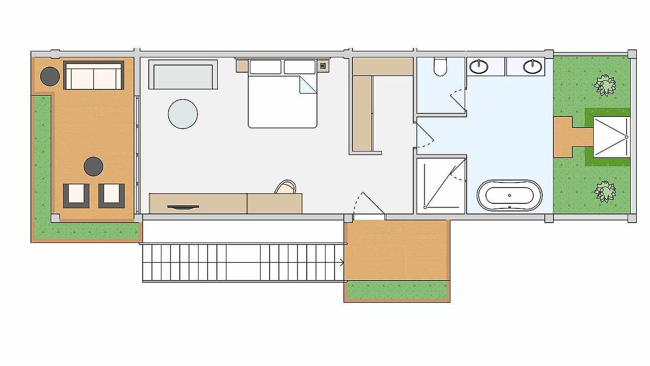 房型介绍:本房型拥有面向花园的露台,配有日光浴床、座椅和私人泳池(尺寸:245x300厘米,深度:120厘米),拥有1张特大号床,1张沙发床(100x200厘米),1张可折叠床(90x180厘米),婴儿床(含)