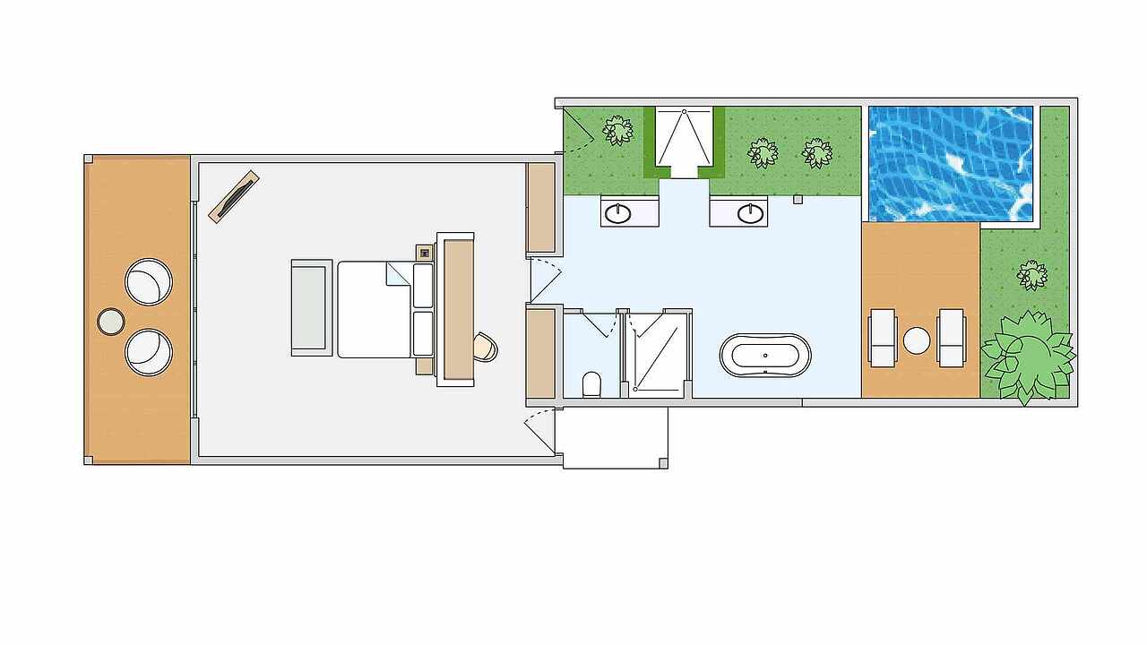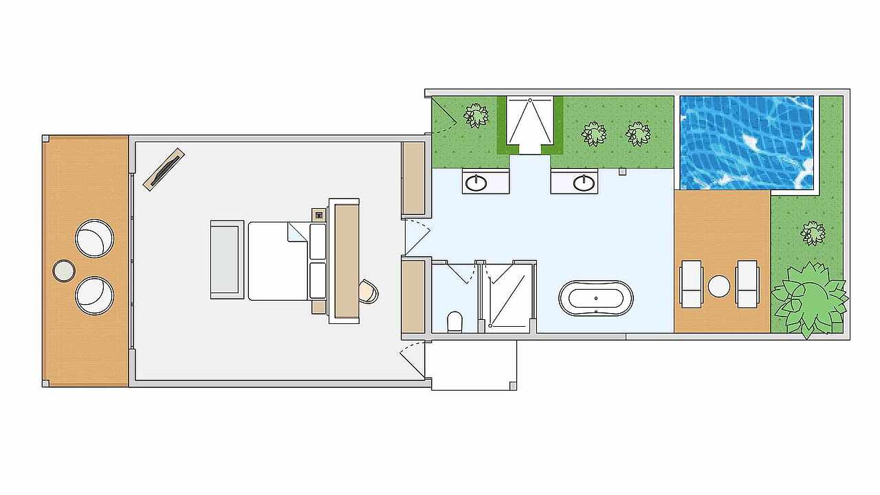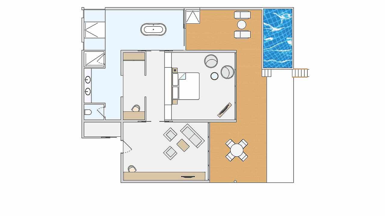 房型介绍:拥有1张特大床,1张沙发床(100x200厘米),婴儿床(含)和面向花园的露台,配有日光浴床、座椅和私人泳池(尺寸:245x300厘米,深度:120厘米)。