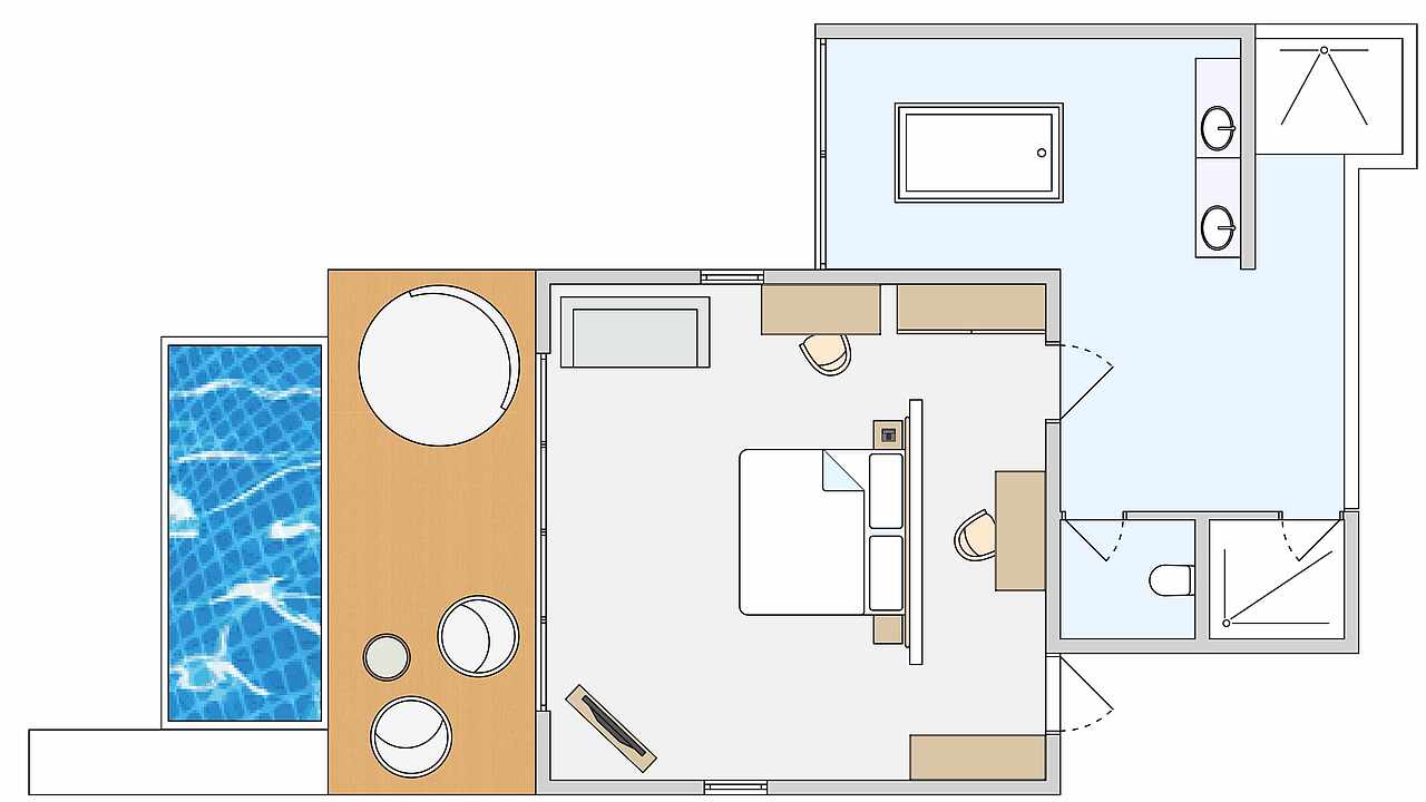 房型介绍:建立在码头的泻湖上,可以欣赏到海景,可以随时下水浮潜、玩水,因此建议9岁以上儿童入住。拥有1张双人床,1张沙发床(100x200厘米),1张可折叠床(90x180厘米),婴儿床(含)和露台,配备日光浴床、座椅和私人泳池(尺寸:200x410厘米,深度:120厘米)。