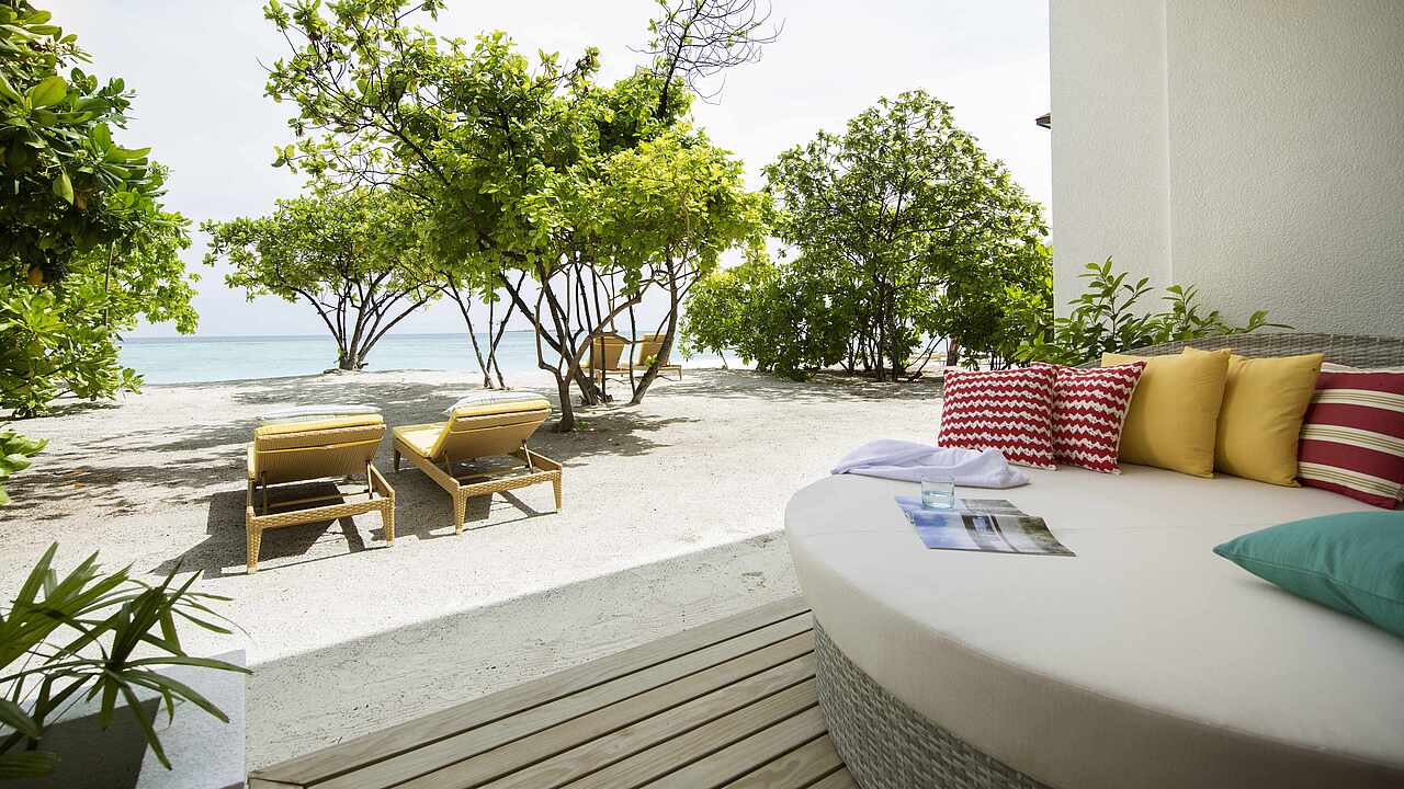 房型介绍:拥有面直向海滩的露台,配有日光床、座椅和私人泳池(尺寸:260x330厘米,深度:120厘米),拥有1张双人床,1张沙发床(100x200厘米),1张可折叠床(90x180厘米),婴儿床(含)。