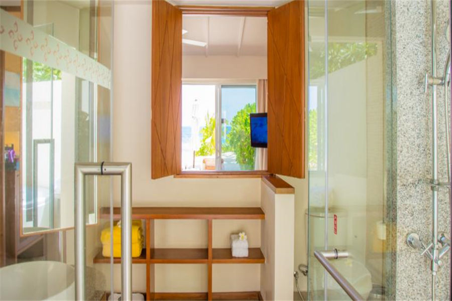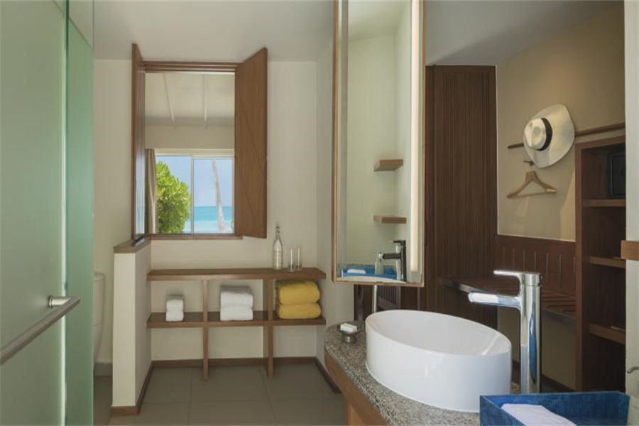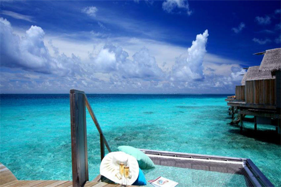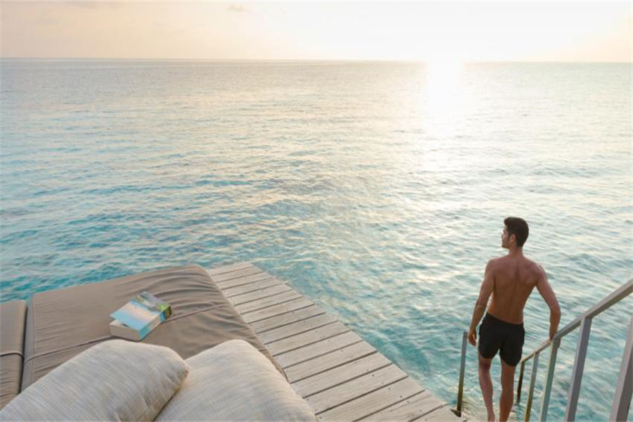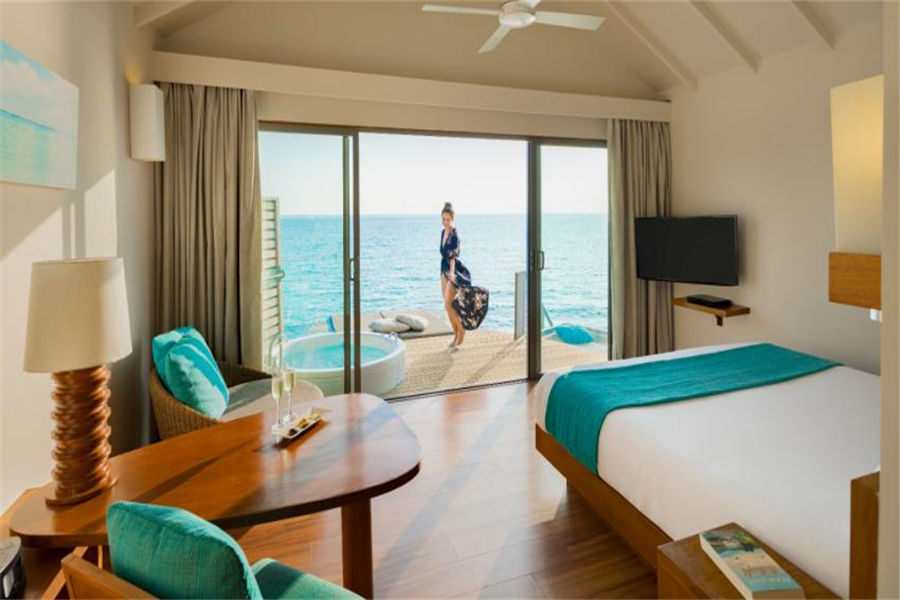 房型介绍:高级豪华日落水上别墅面积42㎡,拥有全岛最佳的位置,露台配置了按摩浴缸和网床,直通泻湖,提供一张特大号床和一个带淋浴的浴室。在露台上悠闲地欣赏海景,在泻湖里自在浮潜,或者到室外水疗浴缸里一边欣赏美景,一边放松身心。