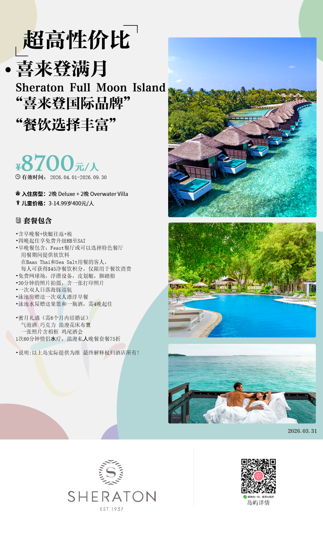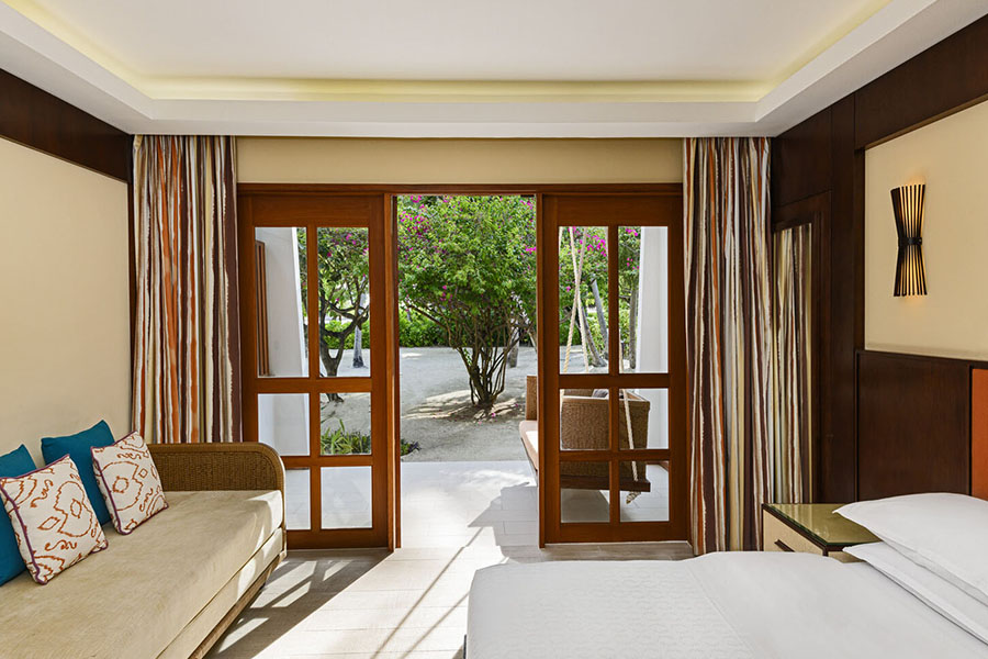 房型介绍:想要体验传统的马尔代夫风格,请体验我们的岛上小别墅它坐落在郁郁葱葱的热带花园中,配备了现代设施,包括宽敬的天井。我们70平方米的家庭友好型别墅最多可容纳3名成人和1名儿童,提供超大规模的喜来登标志性睡眠体验、一张宽敞的沙发床和额外的可折季床。