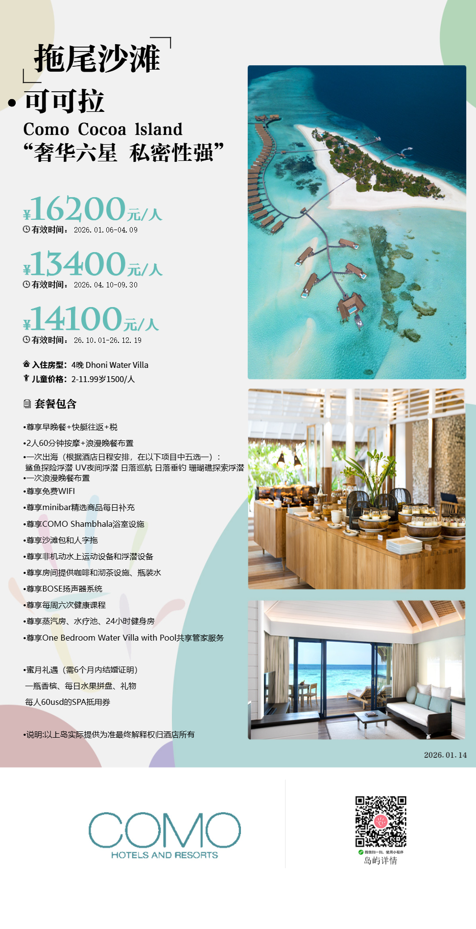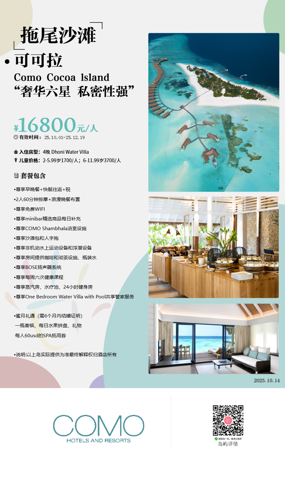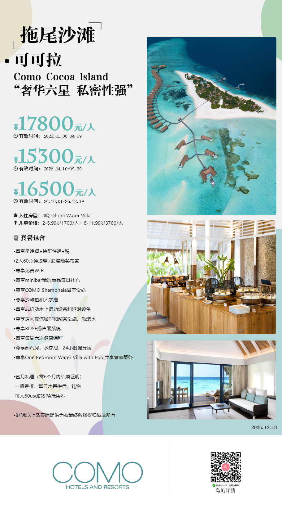 马尔代夫可可亚Como Cocoa lsland,由新加坡COMO集团打造,于2019年重新装修,乘坐快艇40分钟即可到达。岛屿较小,仅仅只有34栋水屋,所有水屋均是多尼船造型,在马尔代夫也算是独特的存在。拥有超过300米的沙滩拖尾。旁边就是鼎鼎大名的古德胡雷居民岛和马尔代夫著名的冲浪圣地。