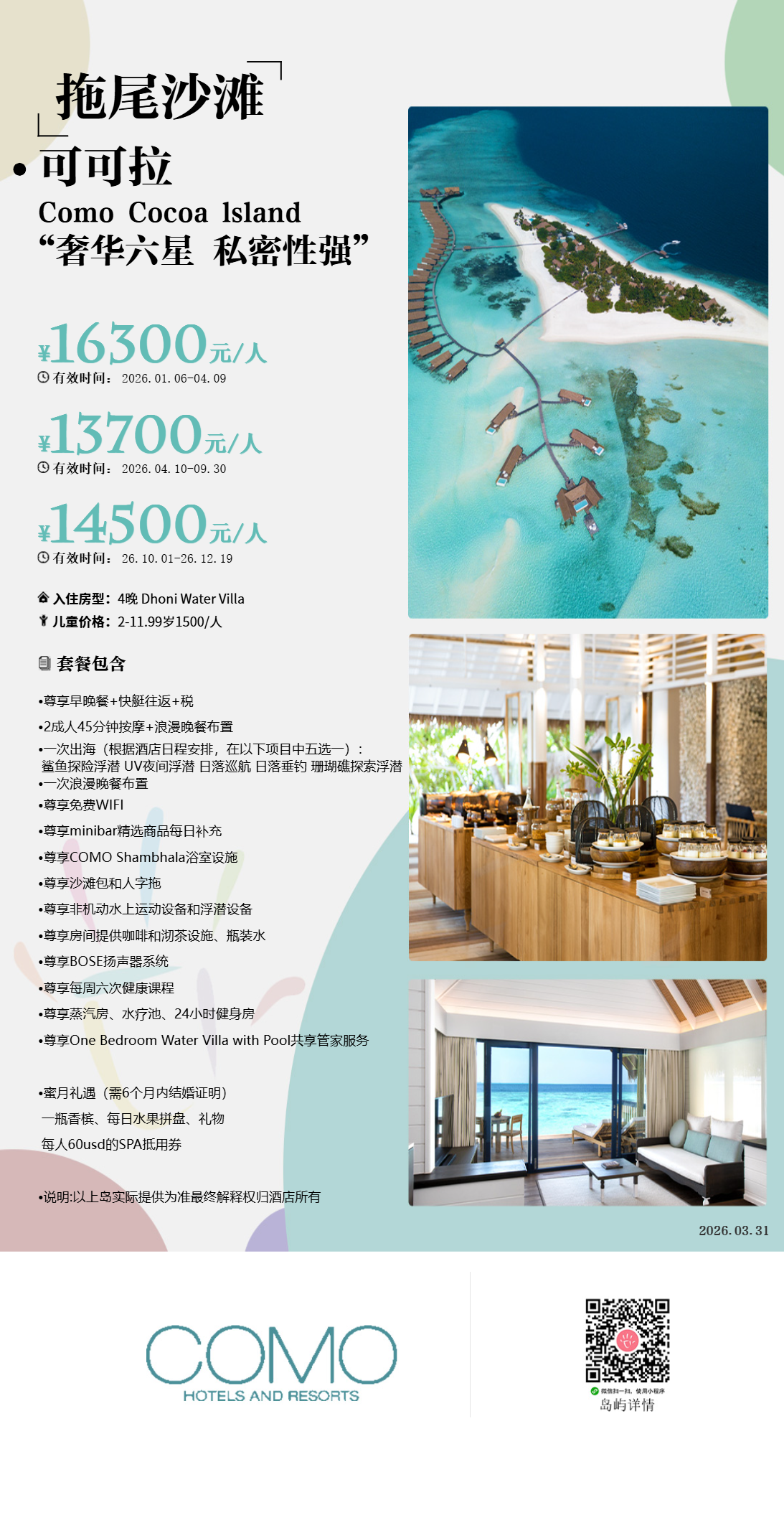 房型介绍:COMO两居室日出别墅非常适合家人和朋友。配有独立的侧房,每间侧房均配有一间卧室套间,一个位于海面上方的私人露台。两侧由共享起居区和用餐区连接,均设有阳台,您可以直接从露台上进入蓝绿色的环礁湖中。别墅还配有一个隐蔽的露台和一个全新私人游泳池,泳池几乎与海洋相接。