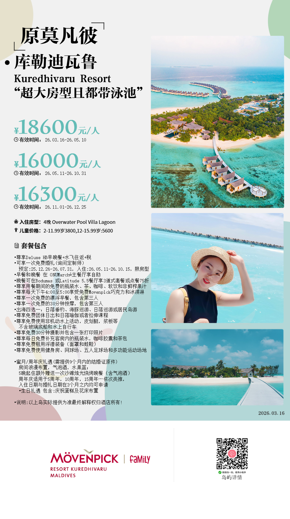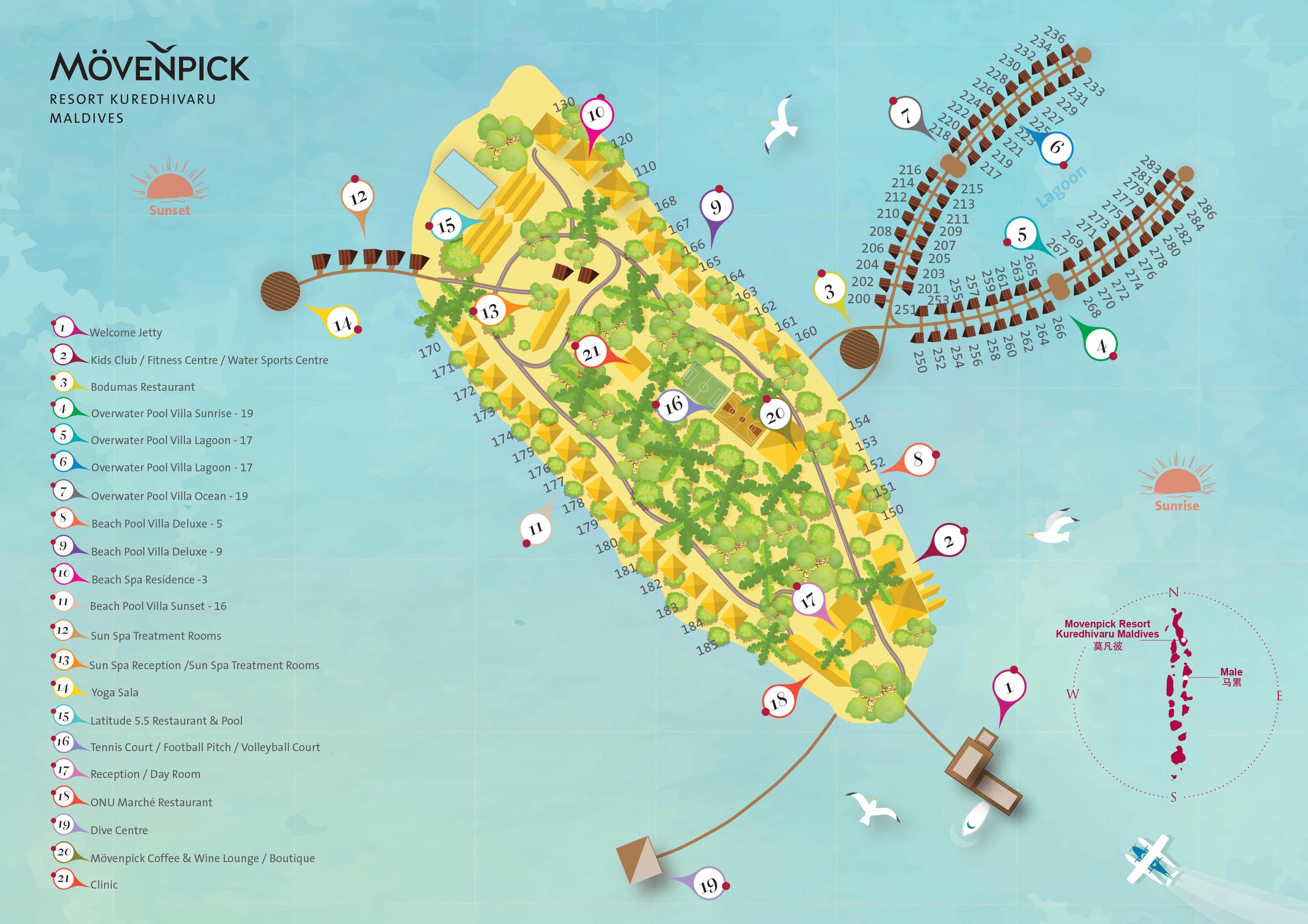 库勒迪瓦鲁Kuredhivaru Resort and Spa,曾用名马尔代夫莫凡彼Movenpick Resort Kuredhivaru Maldives,坐落在平静祥和的诺鲁环礁 (Noonu Atoll) 地区的原生态热带绿洲。从马累国际机场乘坐水上飞机45分钟即可抵达。岛上拥有72套水上泳池别墅、30间海滩泳池套房和3套海滩水疗泳池公寓,所有房型均设有私人泳池!在瑞享度假村,光脚踩在白沙海滩上,尽情探索丰富多彩的海洋生物。畅享四家餐厅的可口美食,饱览壮美的印度洋全景。在Sun Spa by Esthederm 放松身心,在瑜伽中重焕神采,让孩子们在小鸟俱乐部尽情地玩耍。为您量身定制非常特别的马尔代夫体验!滴答滴答,时间到了,莫凡彼度假村每天下午都有 60 分钟供应令人垂涎的可可甜品,让您一整天都有美好心情。