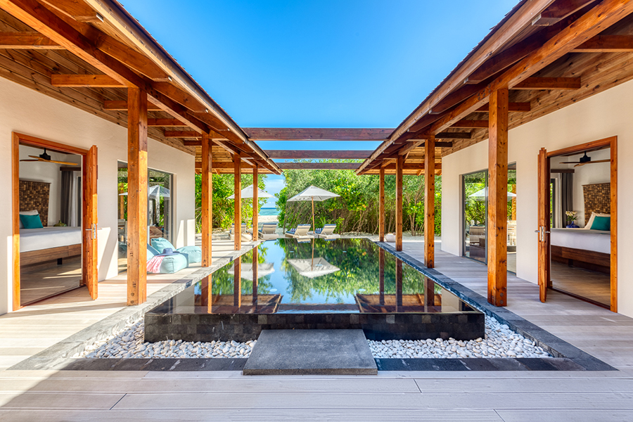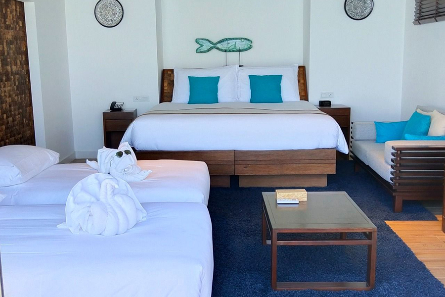 房型介绍:共有三套,每个房间占地230平方米,非常适合团体出行,无论是家庭还是朋友。 有两间宽敞的主卧套房,每间都带有独立浴室,另有一间双床房,一间客厅以及一间按摩室 室外露台可直接通往海滩