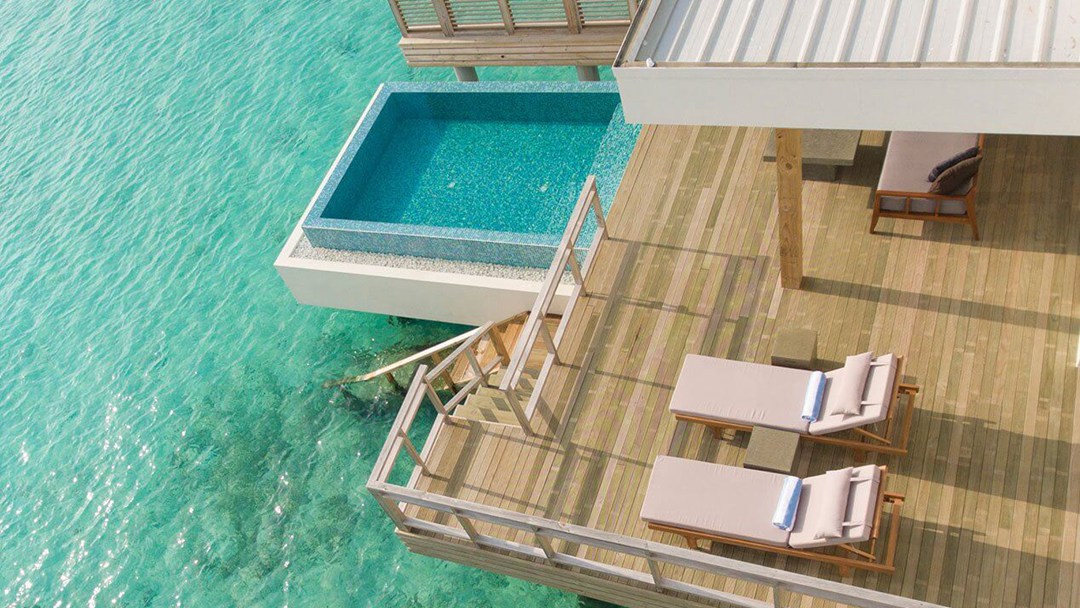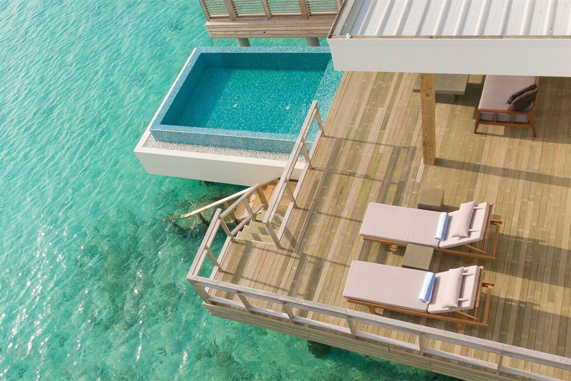 房型介绍:每栋泻湖别墅都伸向透明的海水,设有私人小型游泳池、宽阔的甲板、豪华的开放式浴室以及可欣赏壮丽蓝色海景的住宿,距离别墅仅几步之遥的波光粼粼的珊瑚礁提供了许多水下游览的空间。