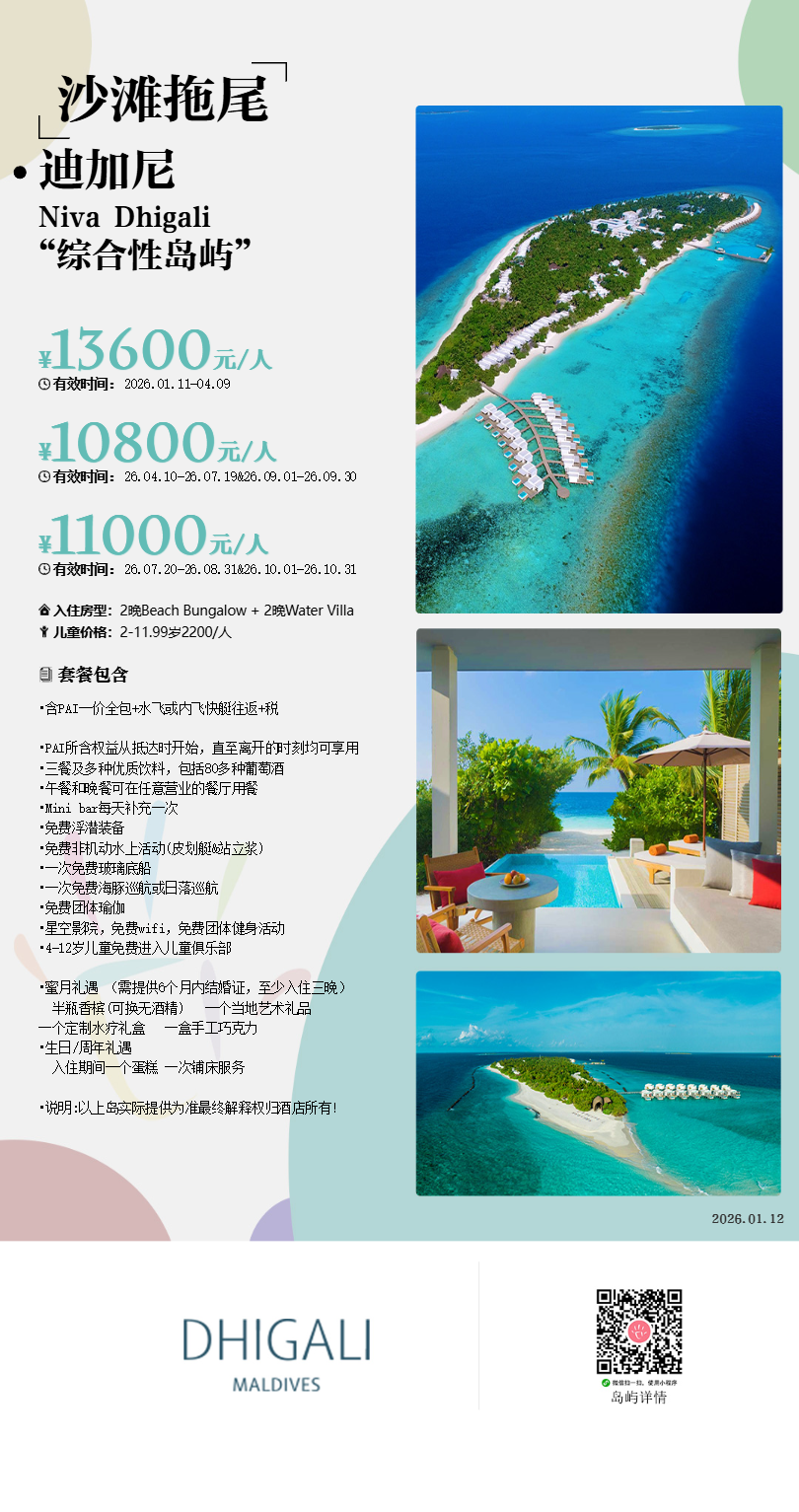 马尔代夫迪加利Dhigali Maldives,2017年6月新开业岛屿,位于Raa环礁上一个狭长的珊瑚岛礁上,整座海岛被白沙,碧海密密环绕,地上满是银屑,其原始和古朴令游客惊叹不已。 在岛上游客很少能见到人为装饰的痕迹,四周全是郁郁葱葱挺拔高大的棕榈。海岛上迂回弯曲的小径宁静秀丽,与现豪华隐秘的度假村浑然一体。整座岛的沙滩很好,细腻且不扎脚,您可随意赤脚在沙滩上与您的爱人家人一起享受惬意时光。这是一个能满足蜜月行及家庭游的超五星清新岛屿,在迪加尼,您能感受到回家的温暖。旗下拥有椰子岛、库拉玛蒂、巴洛斯、薇拉莎露、坎多卢、马富士瓦露、米莱度、法鲁富士等超多度假村,而迪加尼作为最新度假村,拥有超强的综合属性,势必会大火!