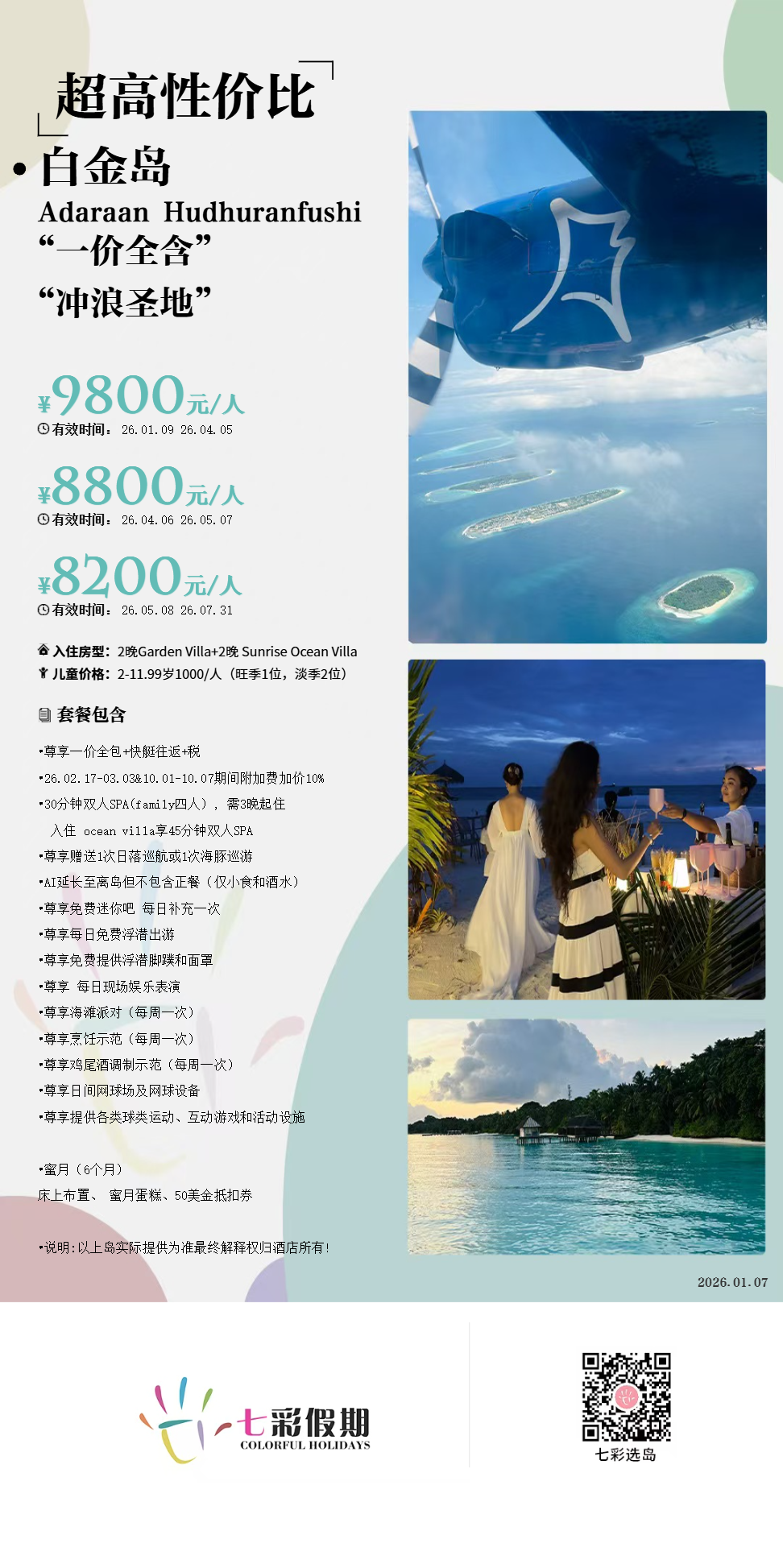 阿达郎集团旗下的第三个岛屿白金岛(Adaraan Hudhuranfushi),酒店于2006年首次开业,2013年水屋翻新,白金岛又名大劳力士岛,距离马累机场25KM,快艇30分钟上岛,四星岛屿但是拥有AI一价全包,岛上放肆嗨,不用害怕有负担,酒店两个餐厅两个酒吧满足整个假期的吃喝,白金岛绝对是性价比的选择。