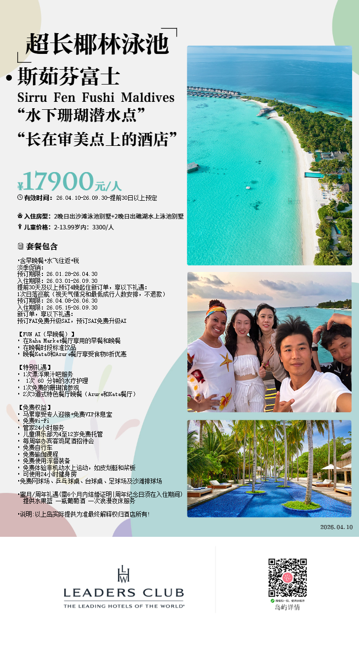 马尔代夫斯茹芬富士Sirru Fen Fushi,岛主安娜亲切的称呼为马尔代夫最网红的度假村,乘坐水上飞机需要55分钟抵达。岛屿1.5公里长,600米宽,一共120间独栋别墅。其中200米长的无边椰林泳池贯穿岛屿成为了地标建筑,非常出片!水下博物馆、艺术馆、海洋生物实验室、环保实验室让度假更有意义。