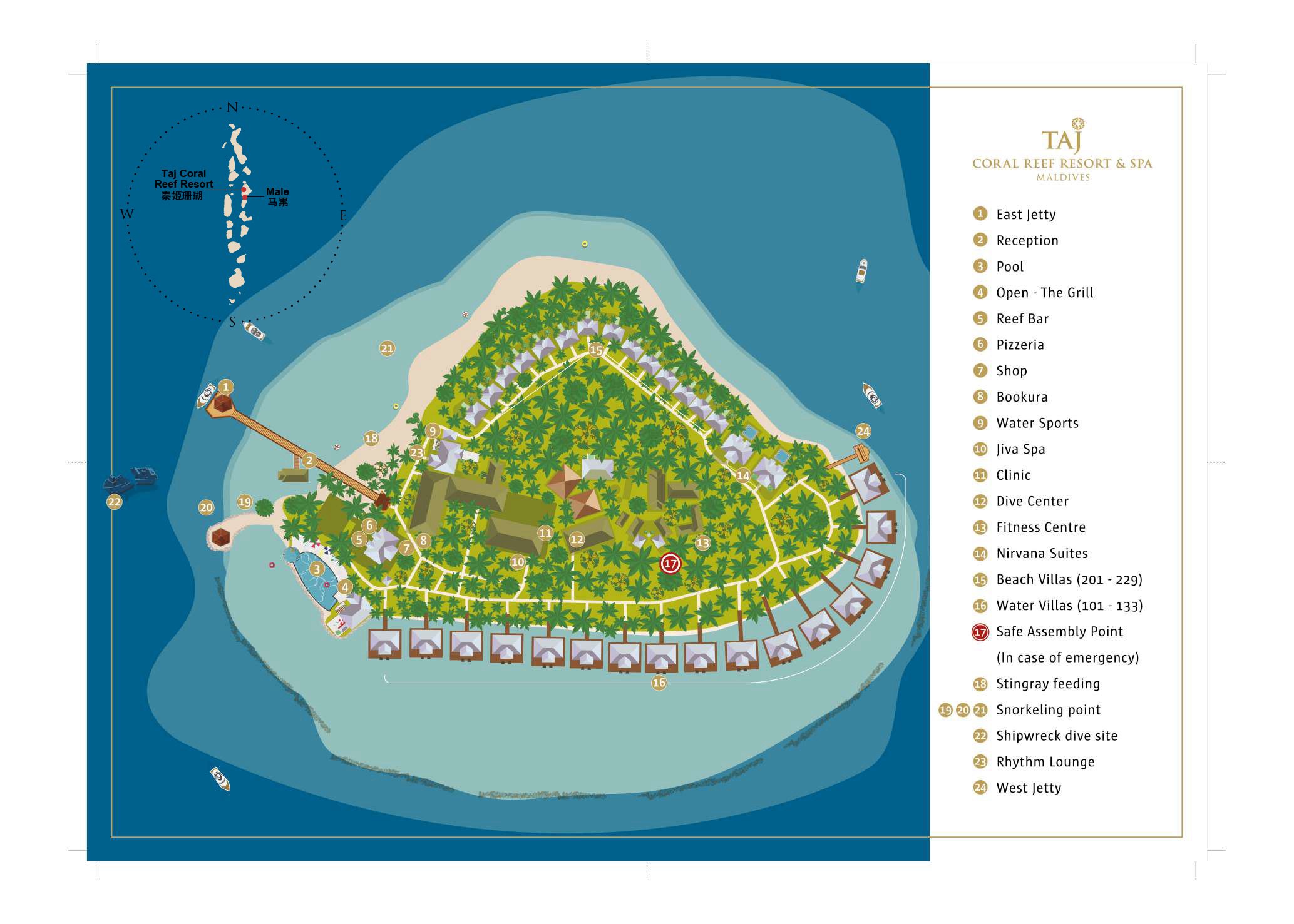 马尔代夫泰姬珊瑚Vivanta Coral Reef Resort by Taj,是TAJ集团下的一个豪华度假村,一个形状类似一颗心的小岛。距离马累国际机场36公里,并可以通过高速船在1小时内可到达。泰姬珊瑚于2008年开始全面翻新,经过全面翻新后的泰姬珊瑚,重新装修了所有的地面建筑;更换了地下管道,海水淡化设备等,房间更加温馨舒适。 Taj Coral Reef 是一个浮潜型的精致岛屿。这里有充满异国情调的美景和令人惊奇的日落海景,是热带度假的理想之地。无论你是想来潜水探索惊艳的海底世界,或是简单找个安静的地方休闲度假,抑或是和最爱的人一起蜜月旅行,泰姬珊瑚毫无疑问是茂密的珊瑚礁,超过600种的外来鱼类和众多的潜水点,一定能让热爱潜水的你拥有一个悠长假期。度假村还为您安排了各种各样的趣味活动,您大可前往酒店私有的礁石和沉船区尽情冒险,邂逅千姿百态的海洋动物和穿梭在礁石丛中的斑斓鱼儿。在海底潜水100英尺,见识海洋世界的奇观。在 Maldives,潜水绝对不容错过。每天给姿态优雅的刺魟喂食是我们二十年来的传统体验。另外,说不定您还有运气碰到当地人称为“海岛守护者”的奇异生物。
