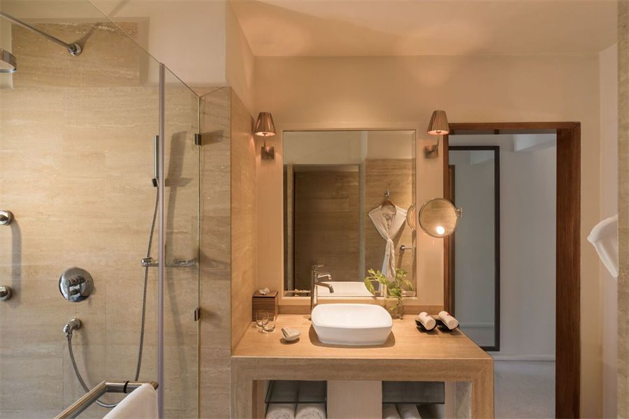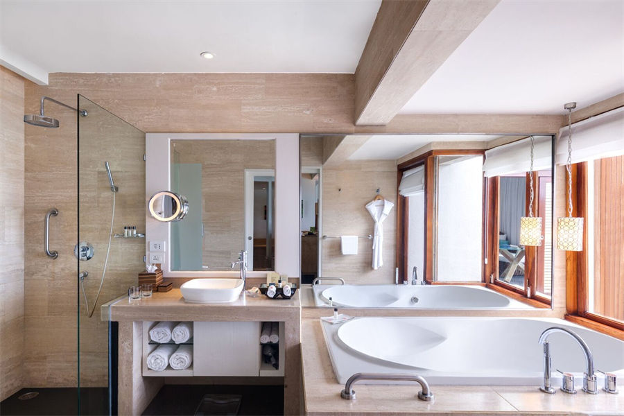 房型介绍:豪华沙滩别墅面积66㎡,有大床房和双床房两种可以选。躺在豪华的特大床上,懒散地看着朝阳在窗外升起,或是最后一抹余晖从飘窗落下。别墅装潢豪华、环境舒适,设计时尚而优雅,自带私人露台,可用于浪漫的私人晚餐,外间拉起浴帘,就是一个封闭的淋浴间。