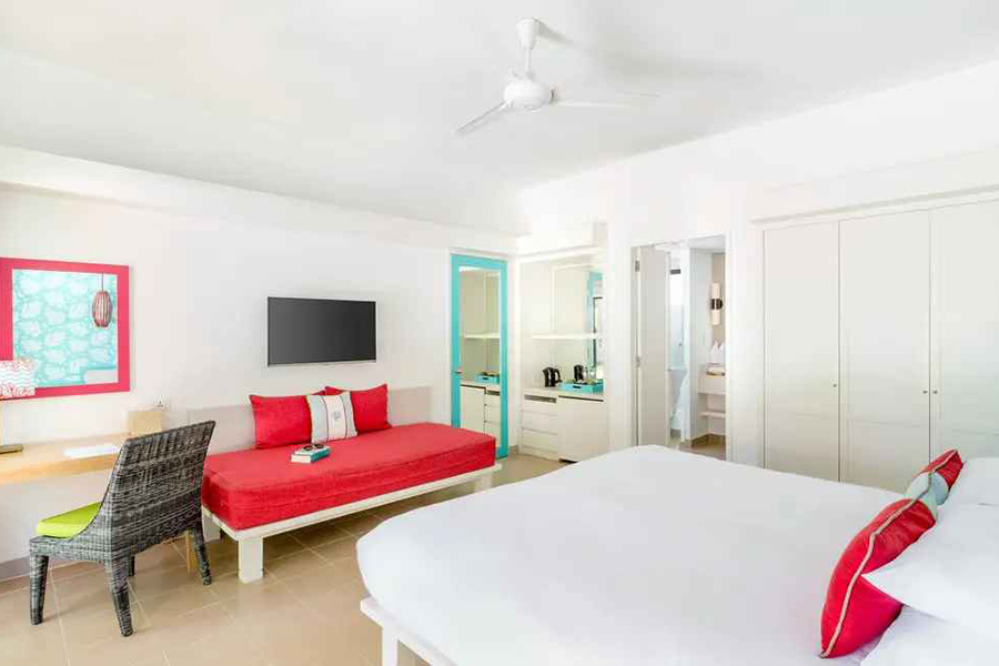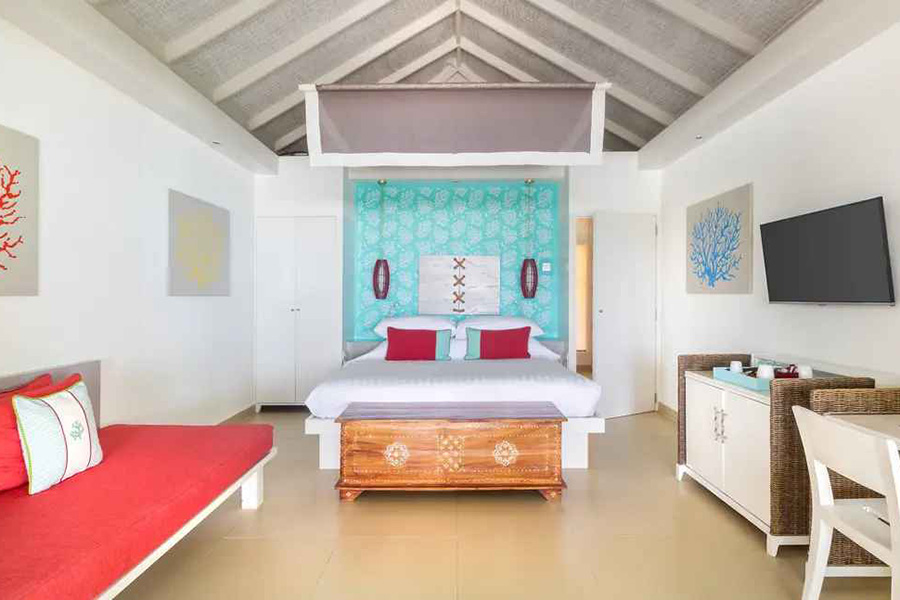 房型介绍:所有这些底楼和二楼的客房都享有泻湖的景色。遍布整个岛屿,其装饰灵感来自大海的颜色,配有绿松石床头板。