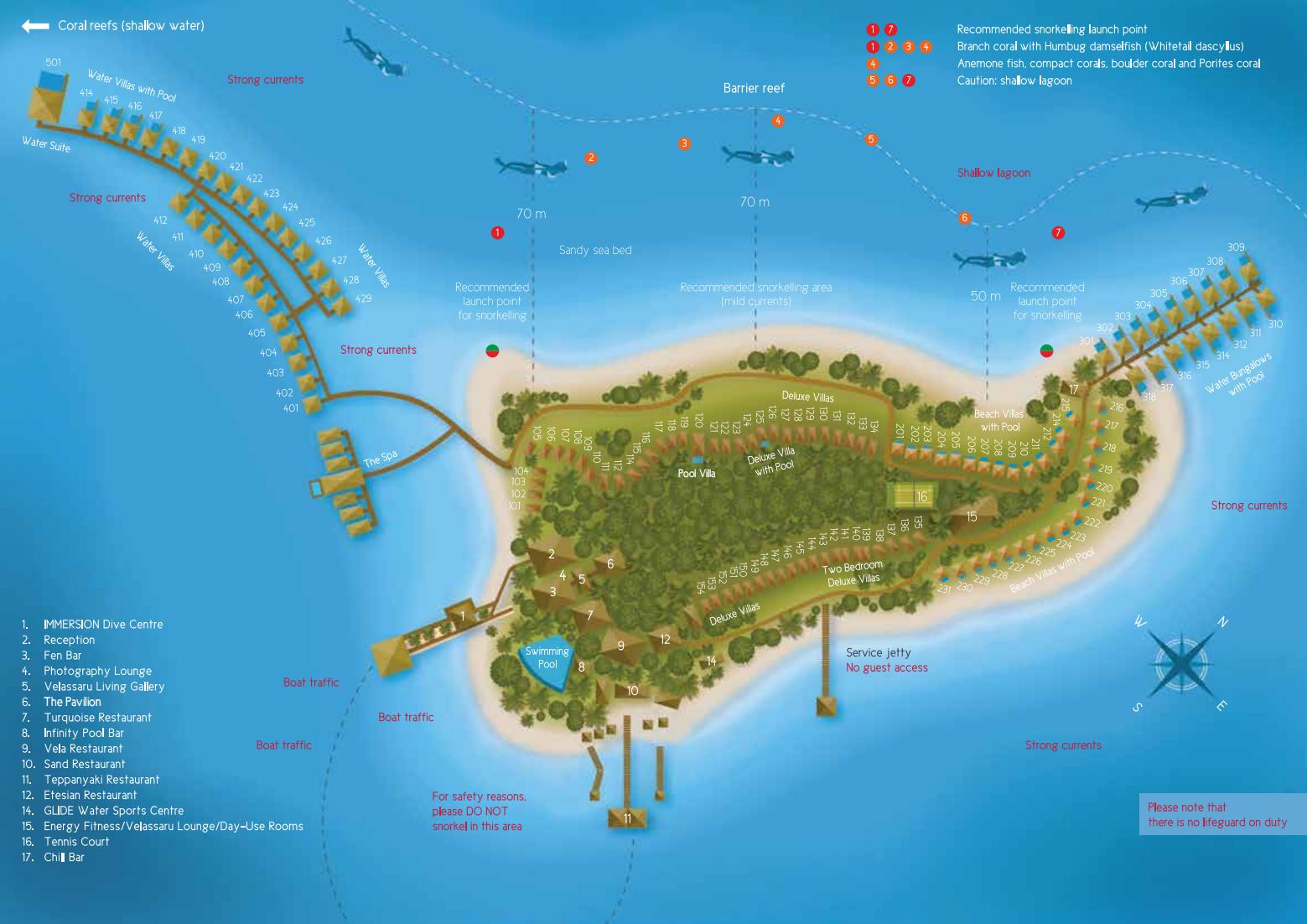 维拉沙鲁(Velassaru Maldives Resort)原名拉古娜岛(Laguna Beach Resort)装修后改名为(Velassaru Maldives Resort),维拉沙鲁位于马累以北187公里壮观的诺鲁环礁怀抱之中,可为客人带来绝无仅有的奢华体验和贵族般的尊享礼遇。维拉沙鲁在设计中融入了私密奢享的指导理念,让印度洋成为岛屿的绝对亮点。为实现与自然环境的和谐统一,修建每座度假别墅时都就地取材,现代风格的内部装修十分精美,犹如一场华丽的感官盛宴。维拉沙鲁约20公顷,长约530米,宽约450米,是您独享天堂的私密度假岛。为实现与自然环境的和谐统一,修建每座度假别墅时都就地取材,现代风格的内部装修十分精美,犹如一场华丽的感官盛宴。维拉沙鲁的名称来源于世世代代栖息在这片海岛上的海龟。设计中微妙地融入海龟壳的颜色与图案,从远处鸟瞰岛屿,水上别墅好似海龟头部,岛屿便是海龟的身体。岛屿的设计出自捷克建筑师Petr Kolar之手,现代化的整体设计中不乏私密元素和马尔代夫的独特风情。岛主Jiri Smejc,这对来自于捷克的富豪夫妻游览了马尔代夫众多度假村,始终无法找到心仪的岛屿,最终自己开一个岛吧,这也是马尔代夫为数不多真正的岛屿。房间设施极具考究,几万块的黑金木桌子,桃花溪木房梁,约旦空运大理石,植被全球精选。