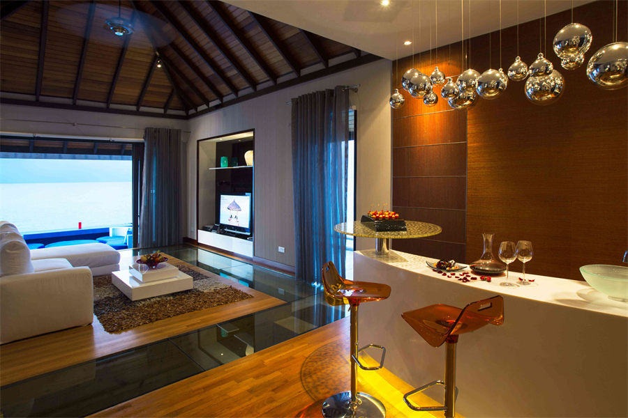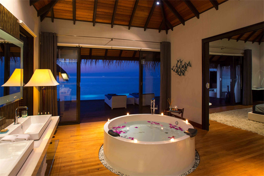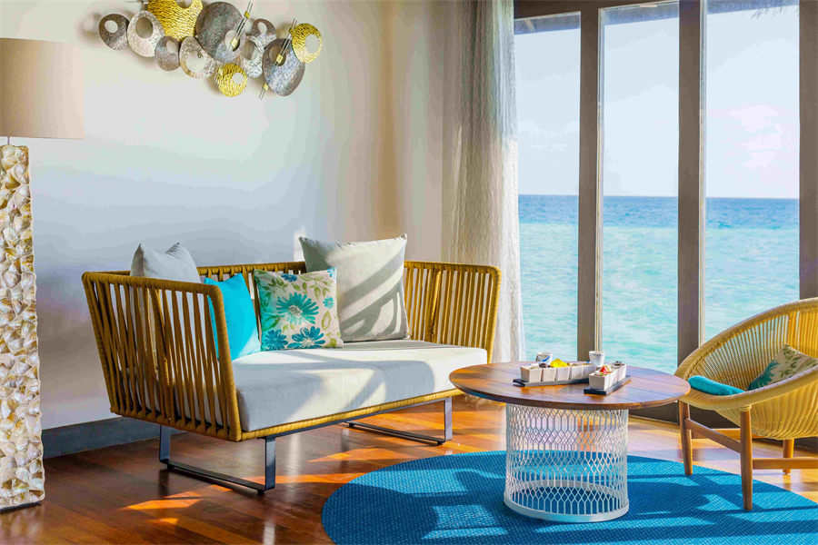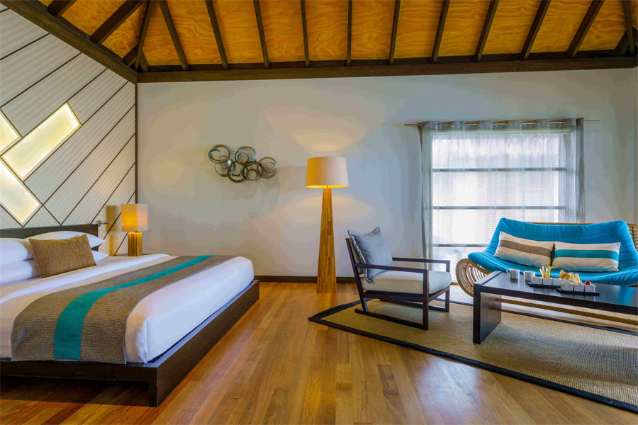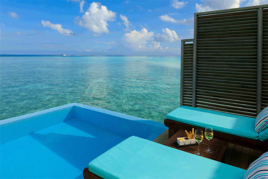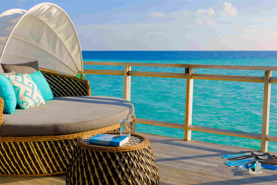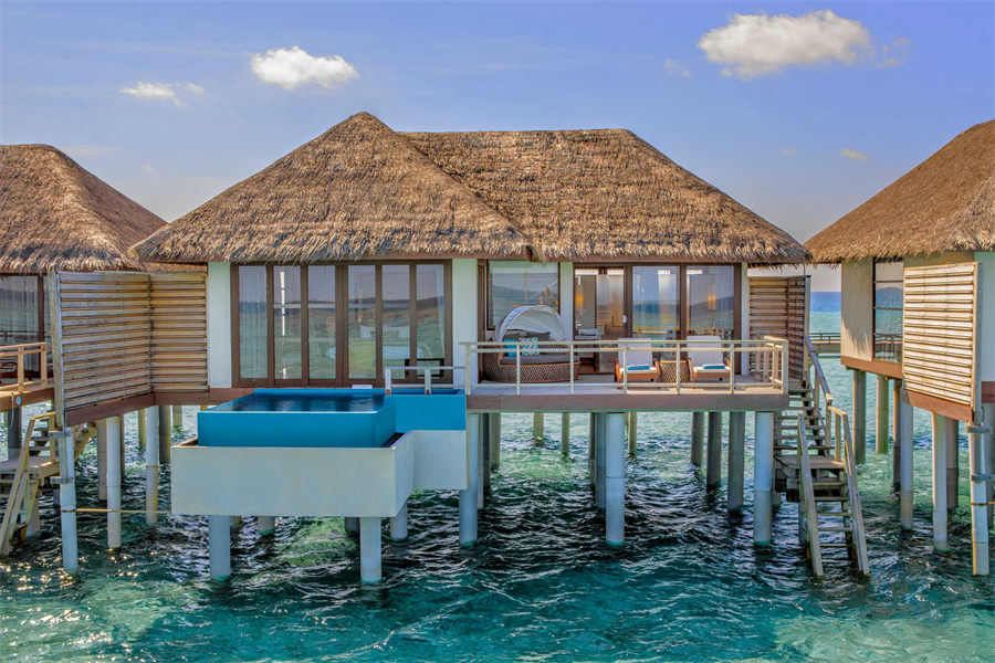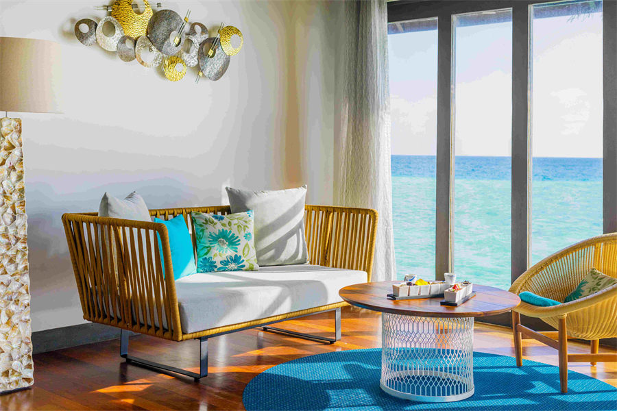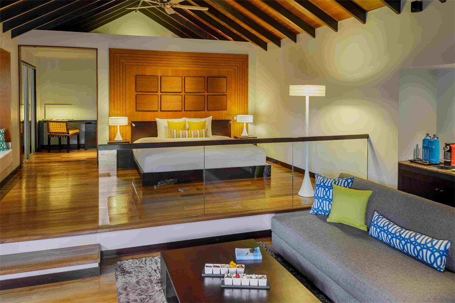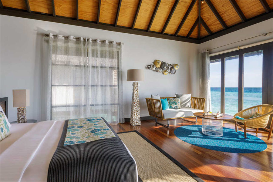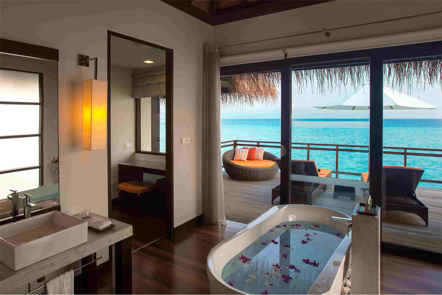 房型介绍:水上别墅优雅地坐落在清澈的碧绿色泻湖之上,是一处亲密的水上圣地,海洋成为你每一个转角的伴侣,落地玻璃窗和门扉可眺望无尽的海景,通向带休息区和直接泻湖入口的日光甲板。