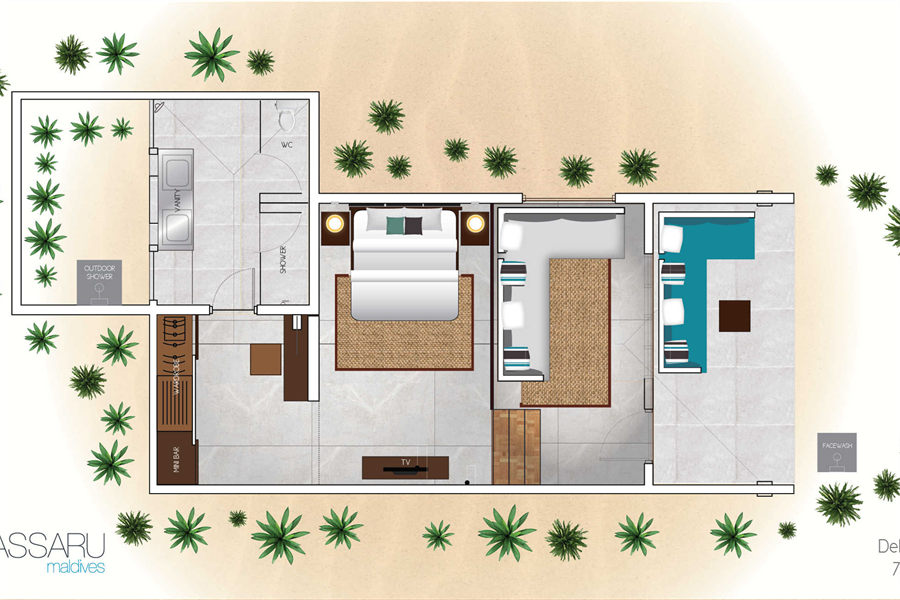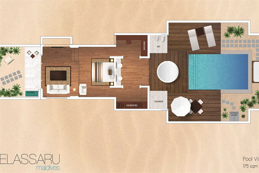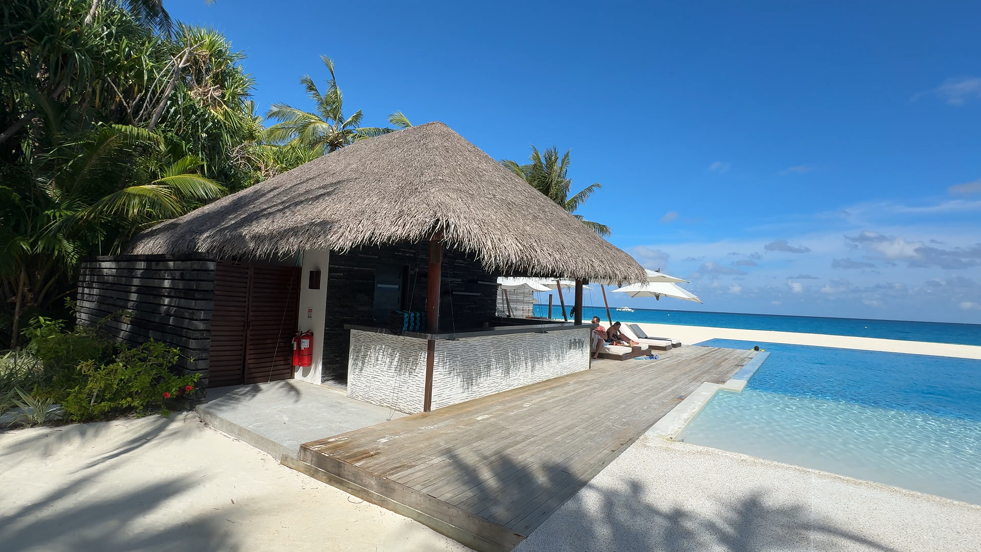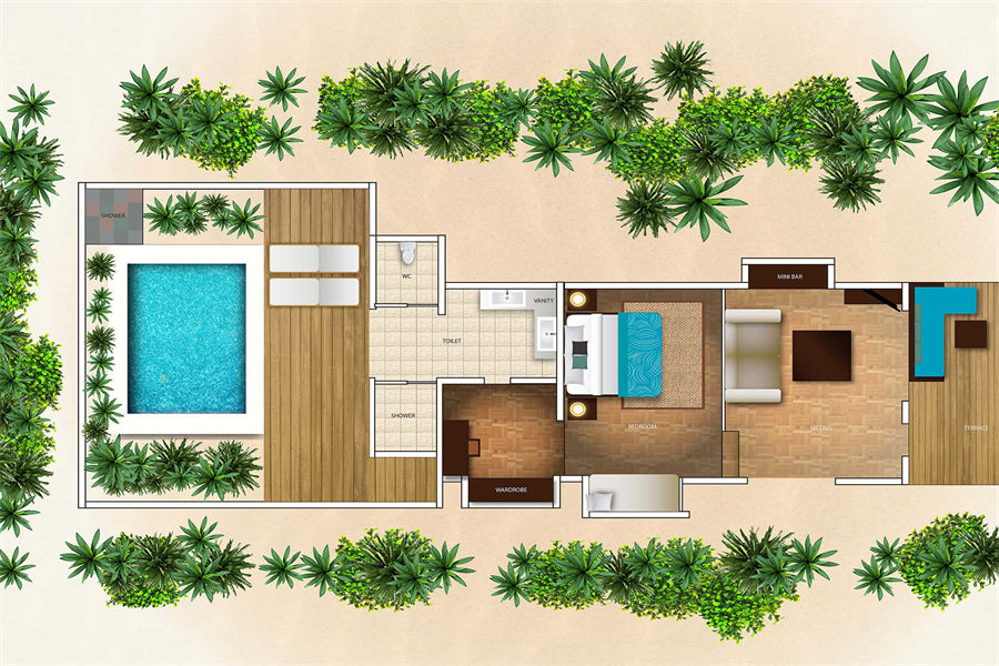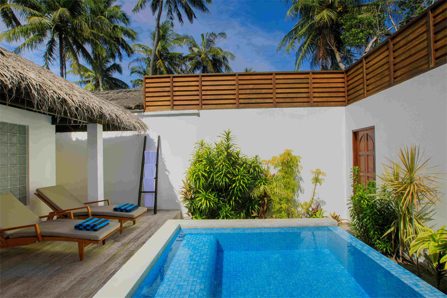 房型介绍:豪华别墅带泳池是岛屿中心的私人泳池隐秘地,面积110平方米,拥有超大泳池、半遮阳露台和户外淋浴,邀请你在热带天空下尽情放松。