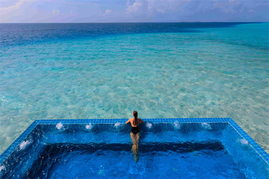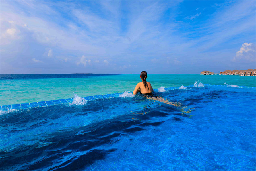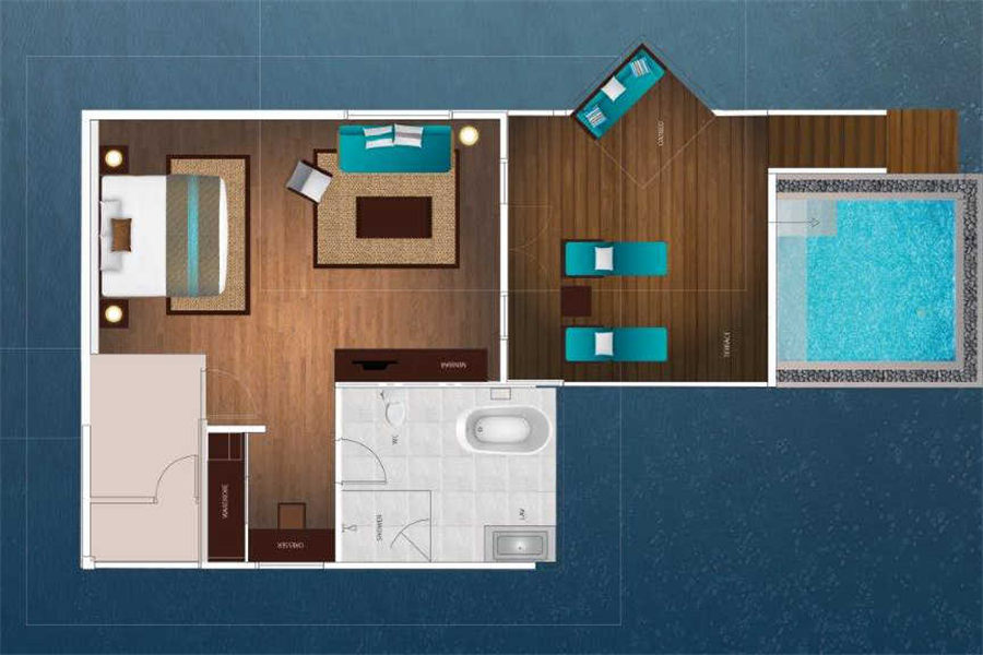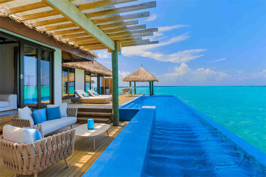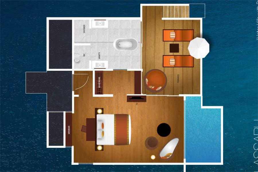 房型介绍:水上泳池别墅坐落在宁静的维拉沙鲁泻湖碧绿色海水之上,面积为112平方米的精致水上生活区,设有俯瞰泻湖的私人无限深潭。这座别墅设计注重舒适与便利,将现代风格与贴心的设施相结合,阳光甲板可直接进入泻湖,并可欣赏全景海景。
