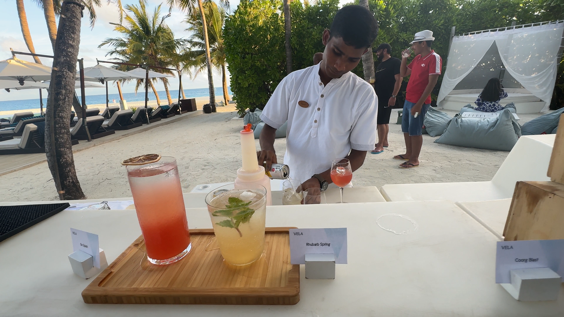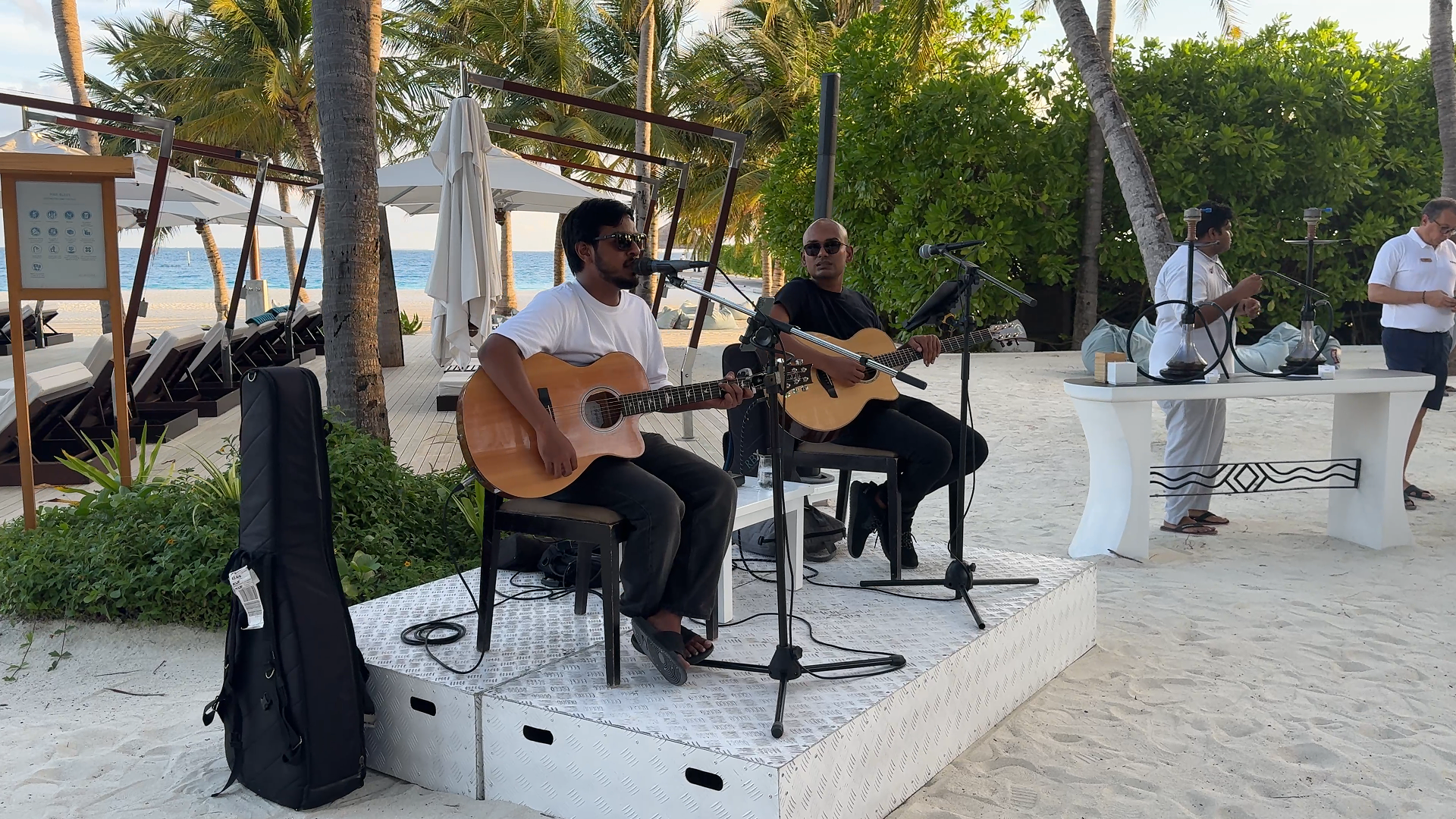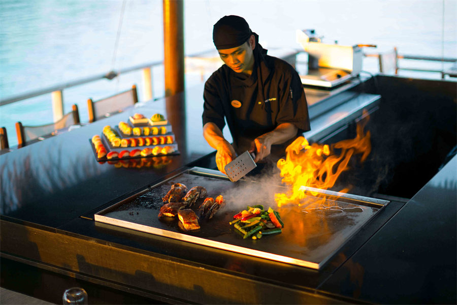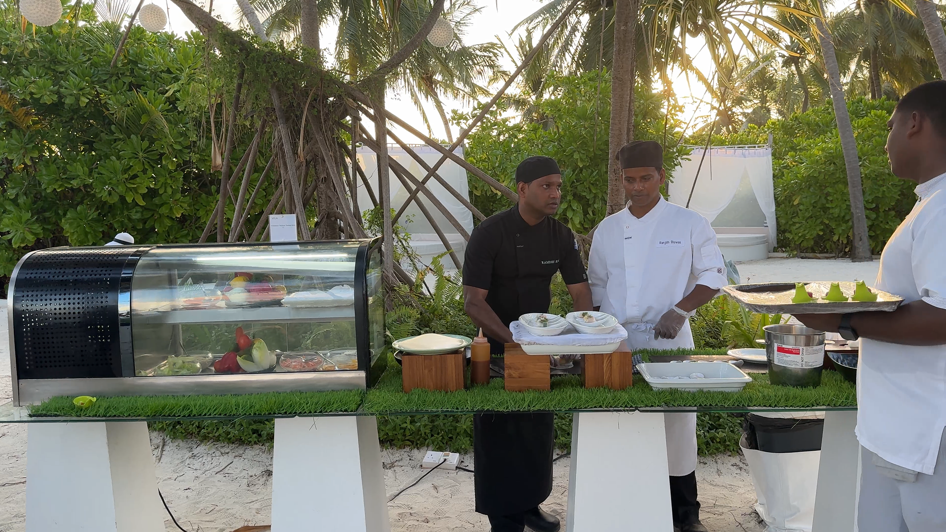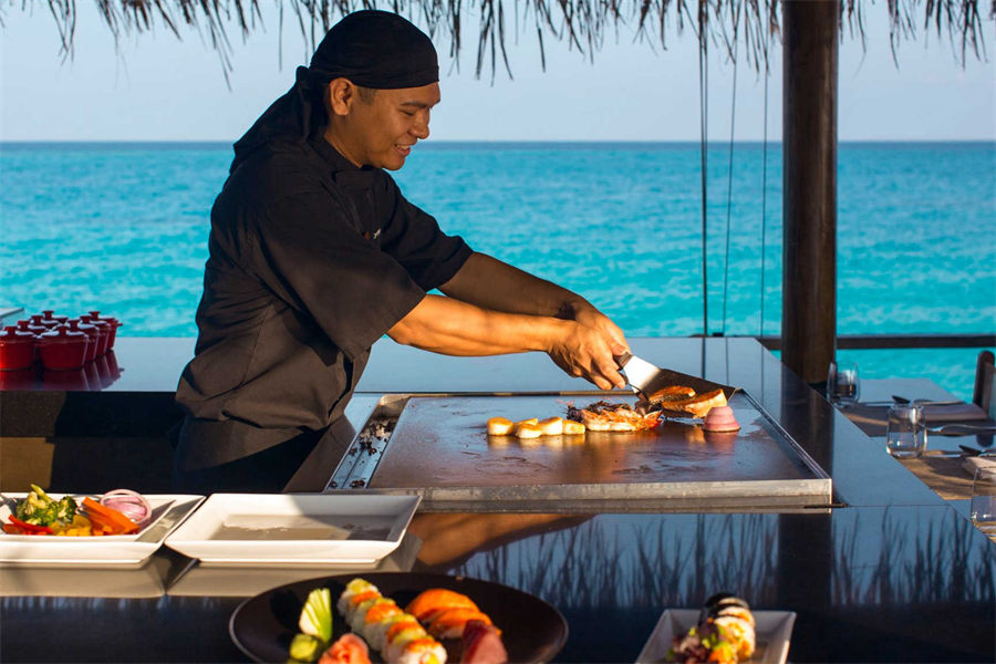 餐厅介绍:沙滩餐厅提供点餐式晚餐,全敞开名厨,让你用餐前看尽厨师们的表演,地处沙滩的凉亭拥有私密的用餐环境。几位服务生也是非常友好,交流得知我们来自中国,经过调侃,大气的承诺今晚的所有酒水小哥免单,没想到维拉沙鲁居然给到一线服务人员这么大的决策权力,并且直接给我们这座凉亭的独立音响放送中国歌曲,归家仪式感拉满!餐前的面包来自三个国家的做法,海鲜酱,奶油蘑菇酱,黄油酱,直接让我连炫两盘,至今这一美味都让我留念回味!今晚的主菜当然是源自印度洋新鲜的生蚝和龙虾大餐,美食和美景都不可辜负。