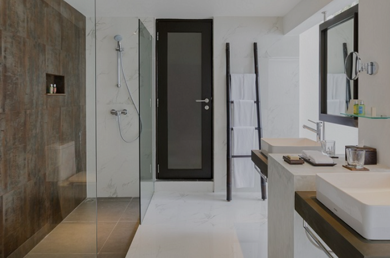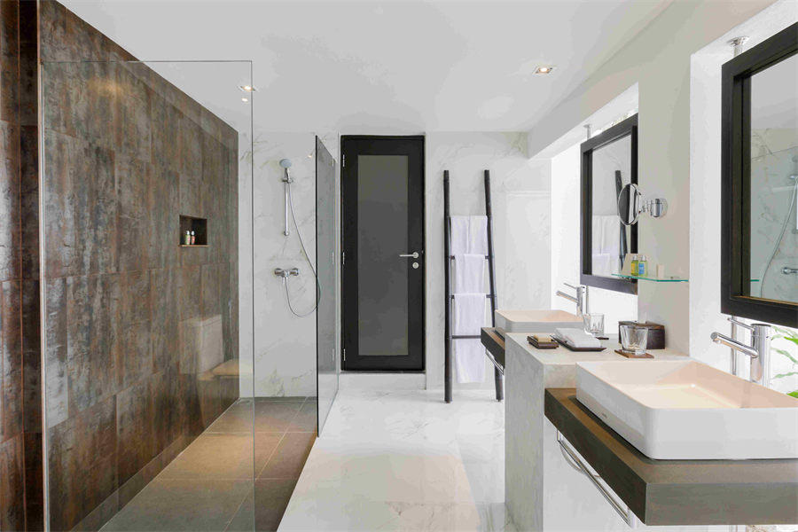花园风格的浴室巧妙融合了室内舒适与户外自由,配备双梳妆台、雨淋淋浴和隐秘户外淋浴,邀请人们在开阔天空下享受清爽时光。
