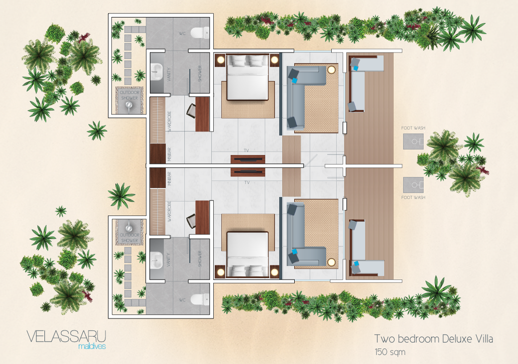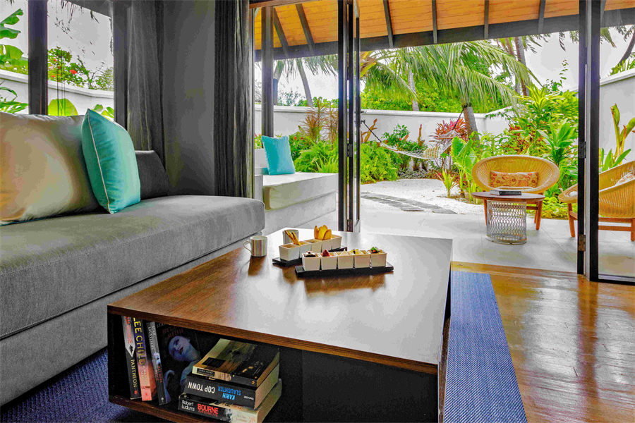 房型介绍:这座位于马尔代夫维拉沙鲁的两卧室豪华别墅,适合团体度假、家庭聚会或与朋友的有意义假期,提供150平方米灵活的花园框架生活空间,连接与隐私完美融合。这座别墅被郁郁葱葱的热带绿意环绕,最多可容纳六名成人或四名成人加四名儿童,配有两间舒适的特大号卧室,通过贴心的室内外空间相连。